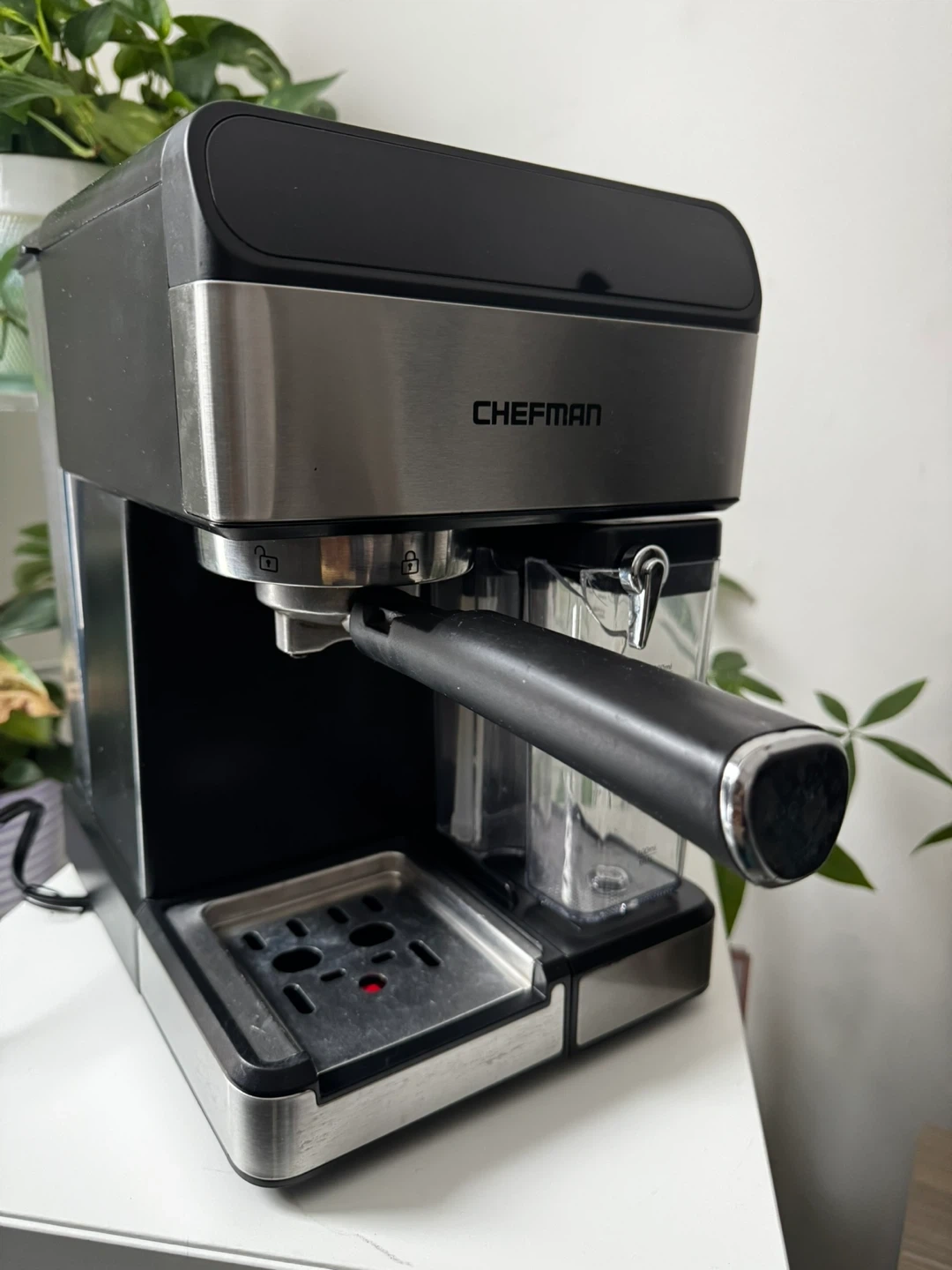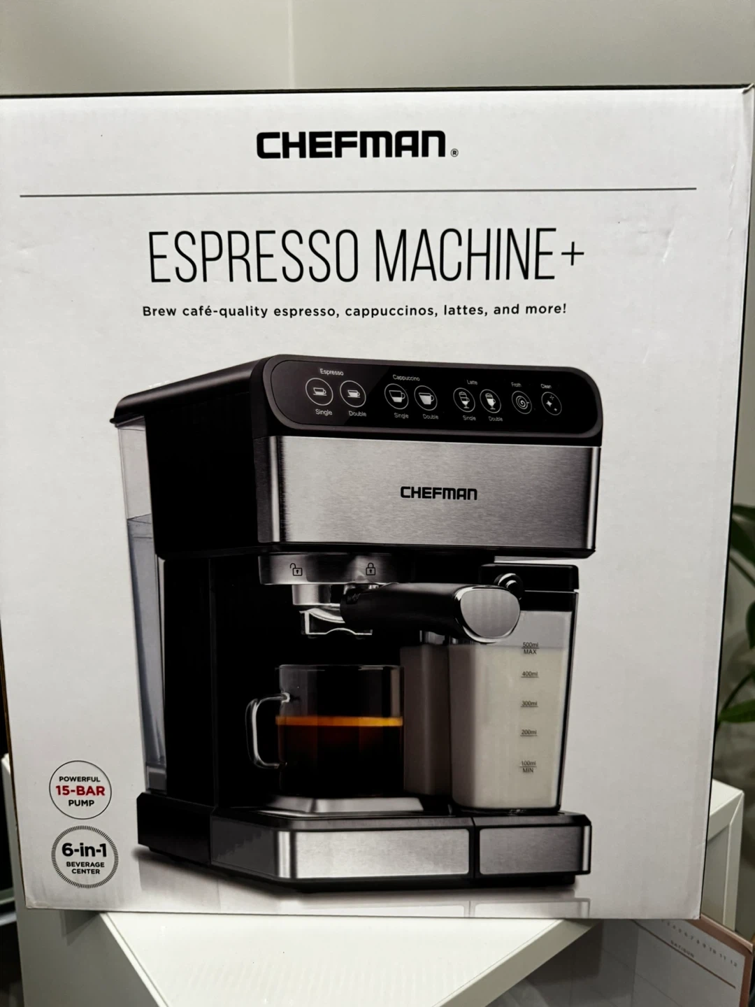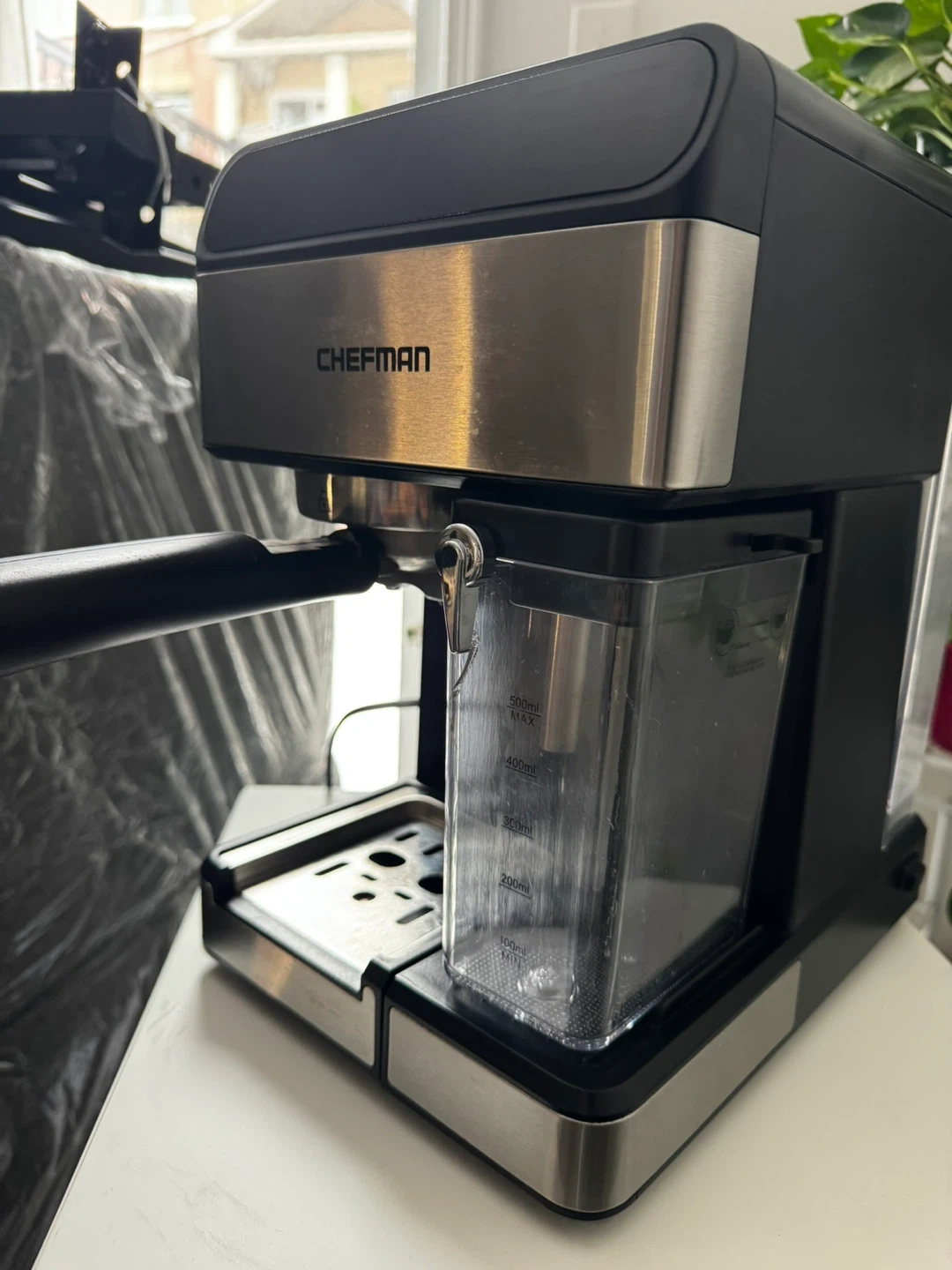 I'm selling a Chefman Espresso Machine+. It's a 6-in-1 beverage center with a powerful 15-bar pump. It can brew café-quality espresso, cappuccinos, lattes, and more! It also has a large 1.8-liter reservoir.The milk container cracked a little bit but working well.