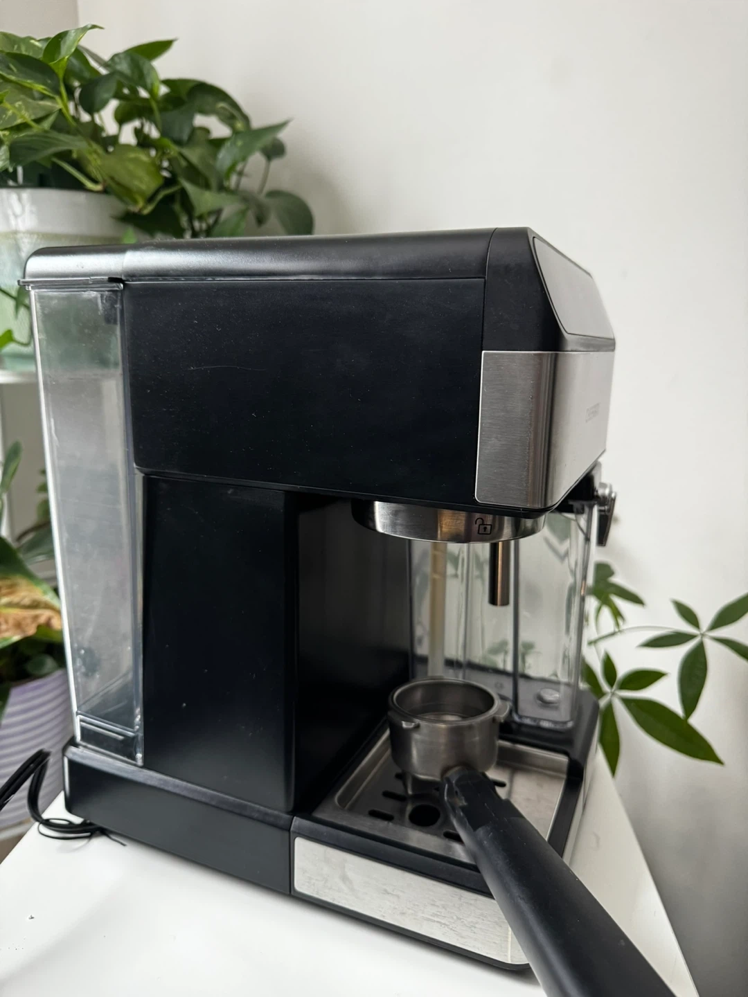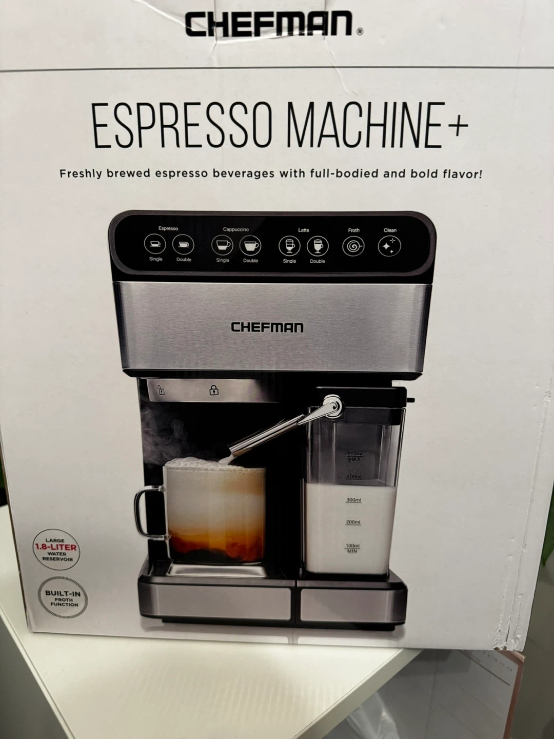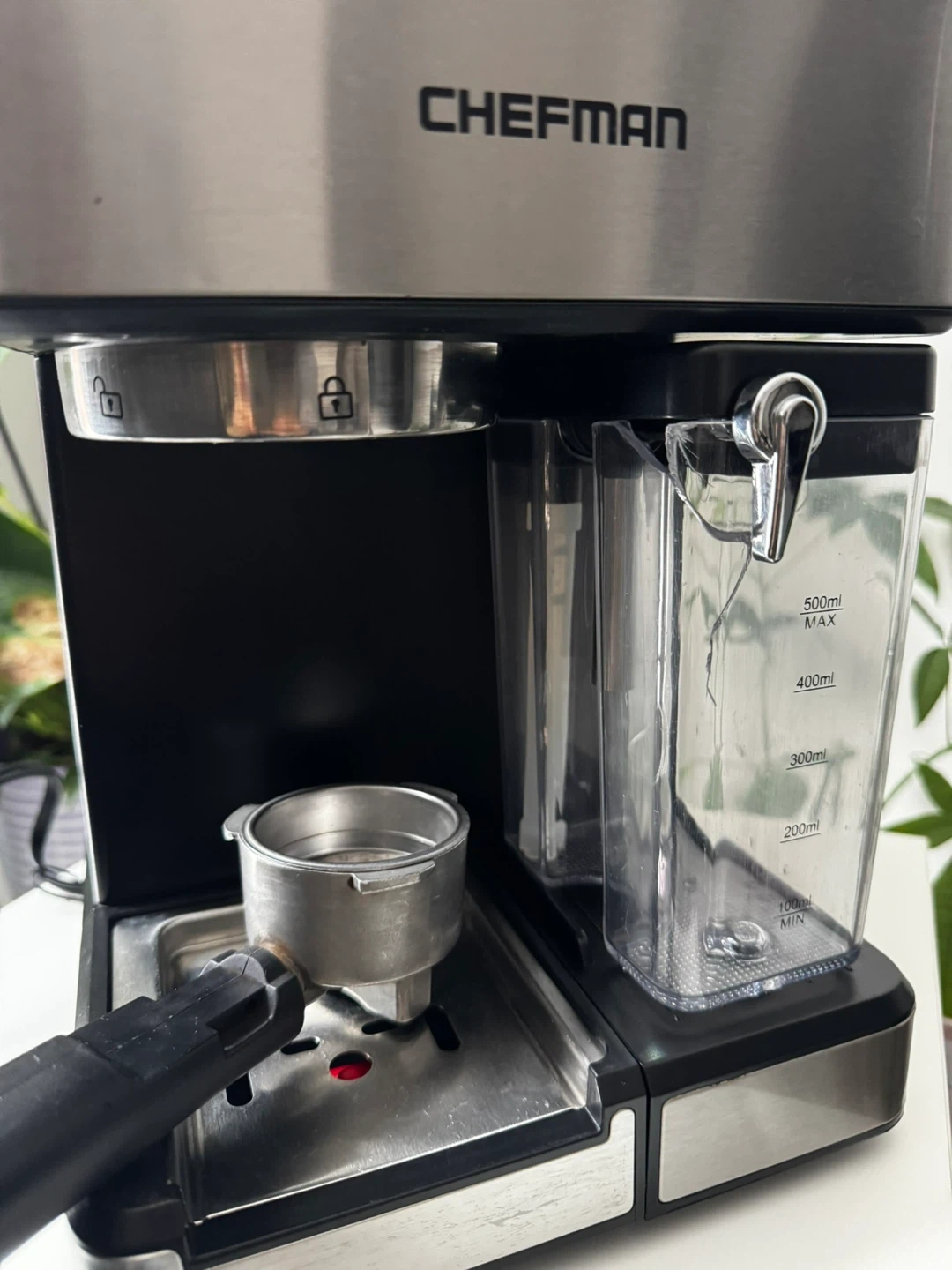 I'm selling a Chefman Espresso Machine+. It's a 6-in-1 beverage center with a powerful 15-bar pump. It can brew café-quality espresso, cappuccinos, lattes, and more! It also has a large 1.8-liter reservoir.The milk container cracked a little bit but working well.