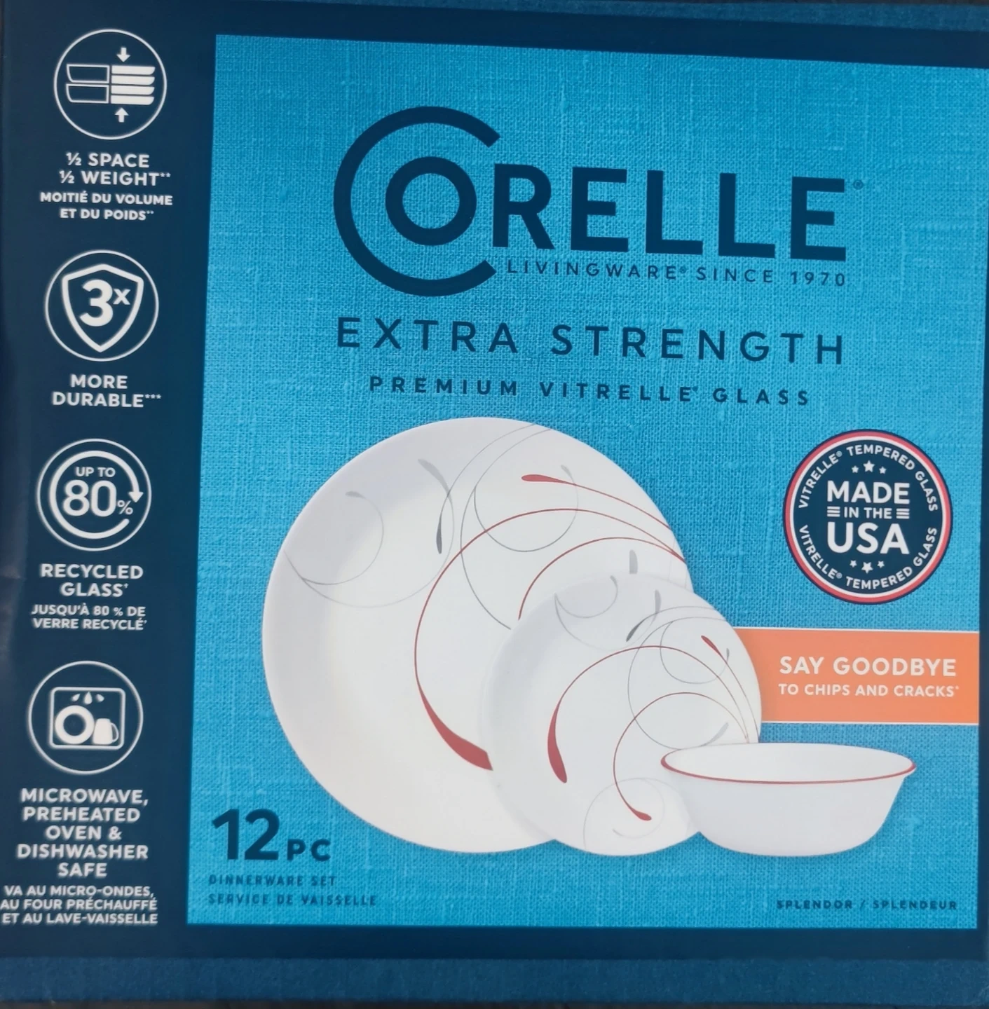 Selling a Corelle 12-piece dinnerware set! It's from the Extra Strength Premium Vitrelle Glass line. This set is microwave, preheated oven, and dishwasher safe. Plus, it's made with up to 80% recycled glass and is extra durable. Say goodbye to chips and cracks!