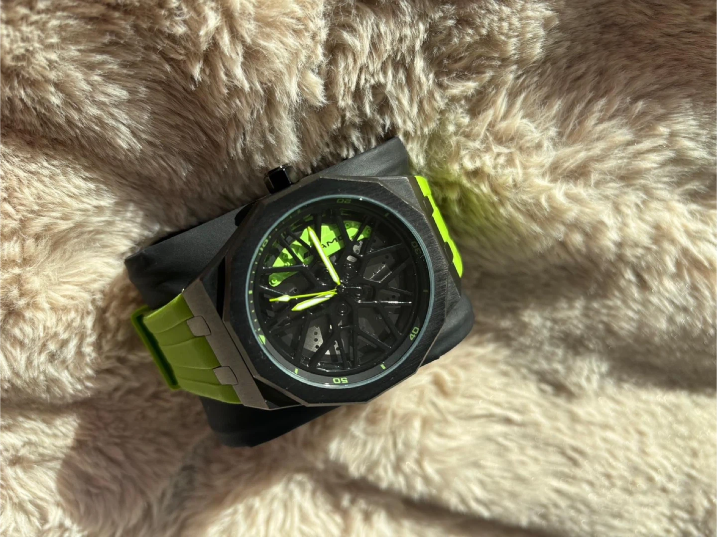 Selling a HMN watch with a vibrant green strap! The watch features a sleek black case and a unique design. It's in great condition and ready to add a pop of colour to your wrist!
