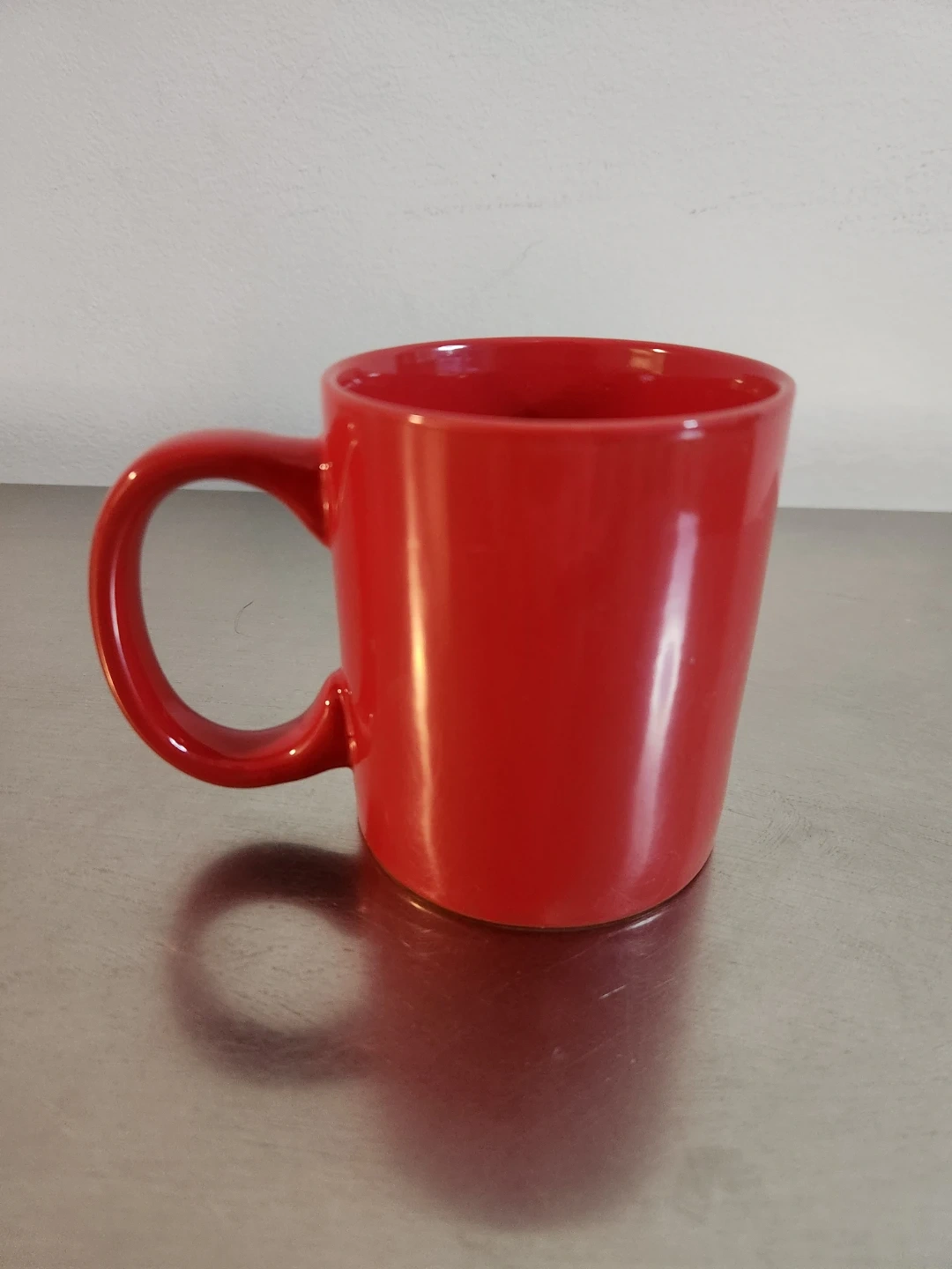 This is a bright red Dr. Seuss mug featuring The Cat in the Hat. It's microwave and dishwasher safe. Ceramic material.