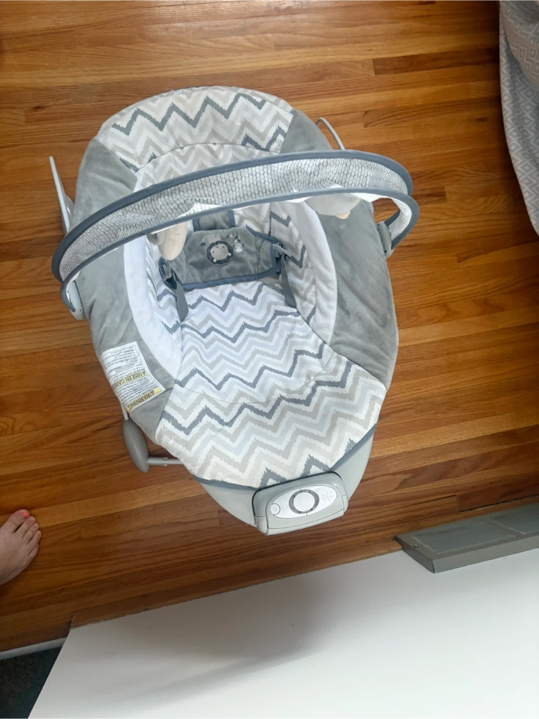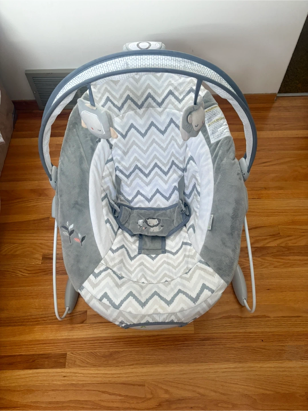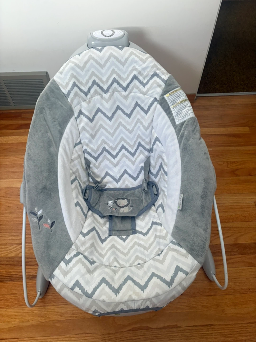 Gently soothe your little one with this baby bouncer seat. It features soft, plush fabrics in a grey chevron pattern and includes gentle vibrations and melodies. The adjustable harness ensures safety and comfort. Includes a new born head piece. Battery operated.