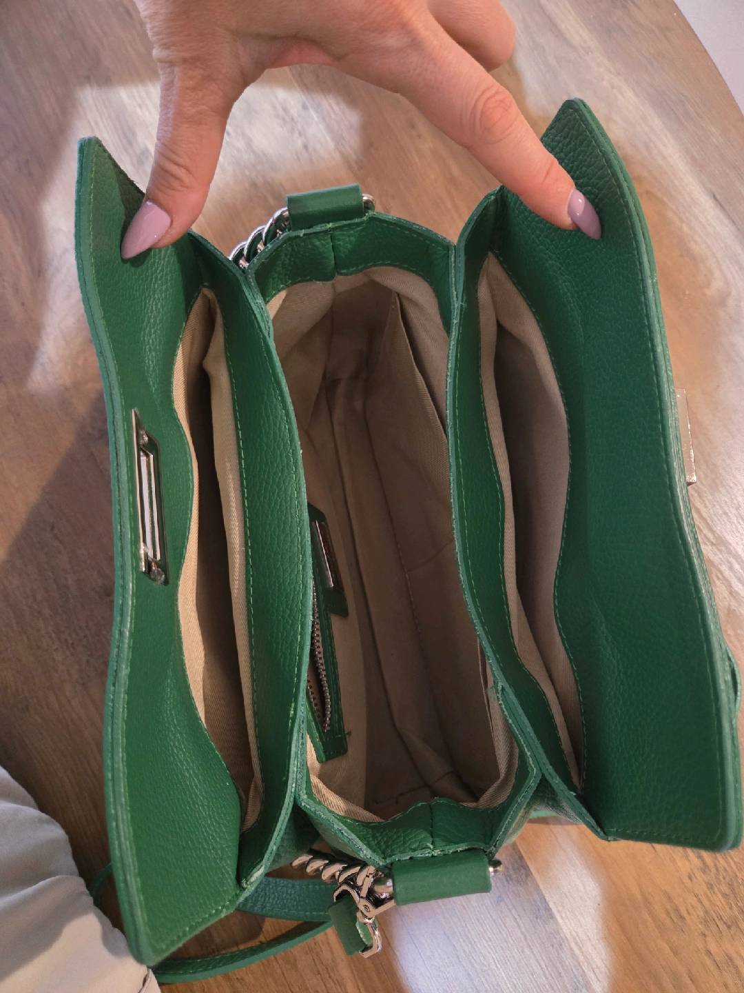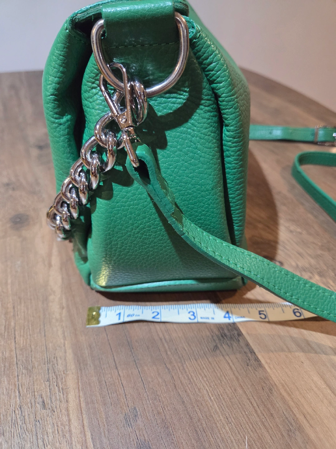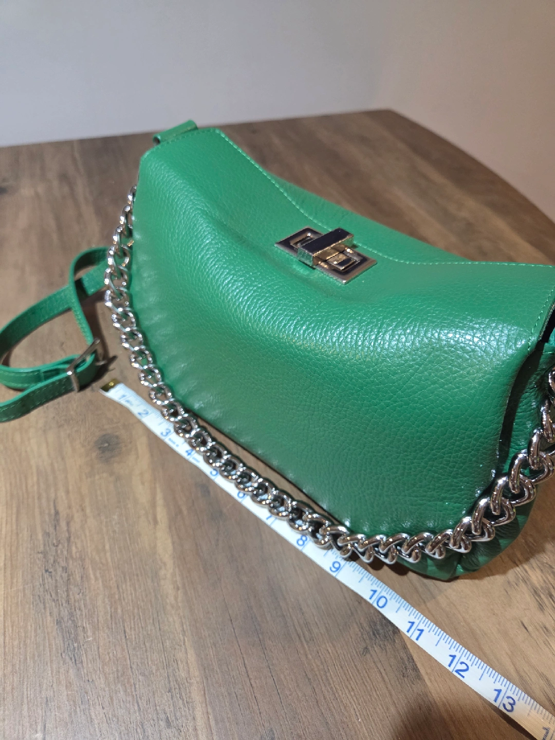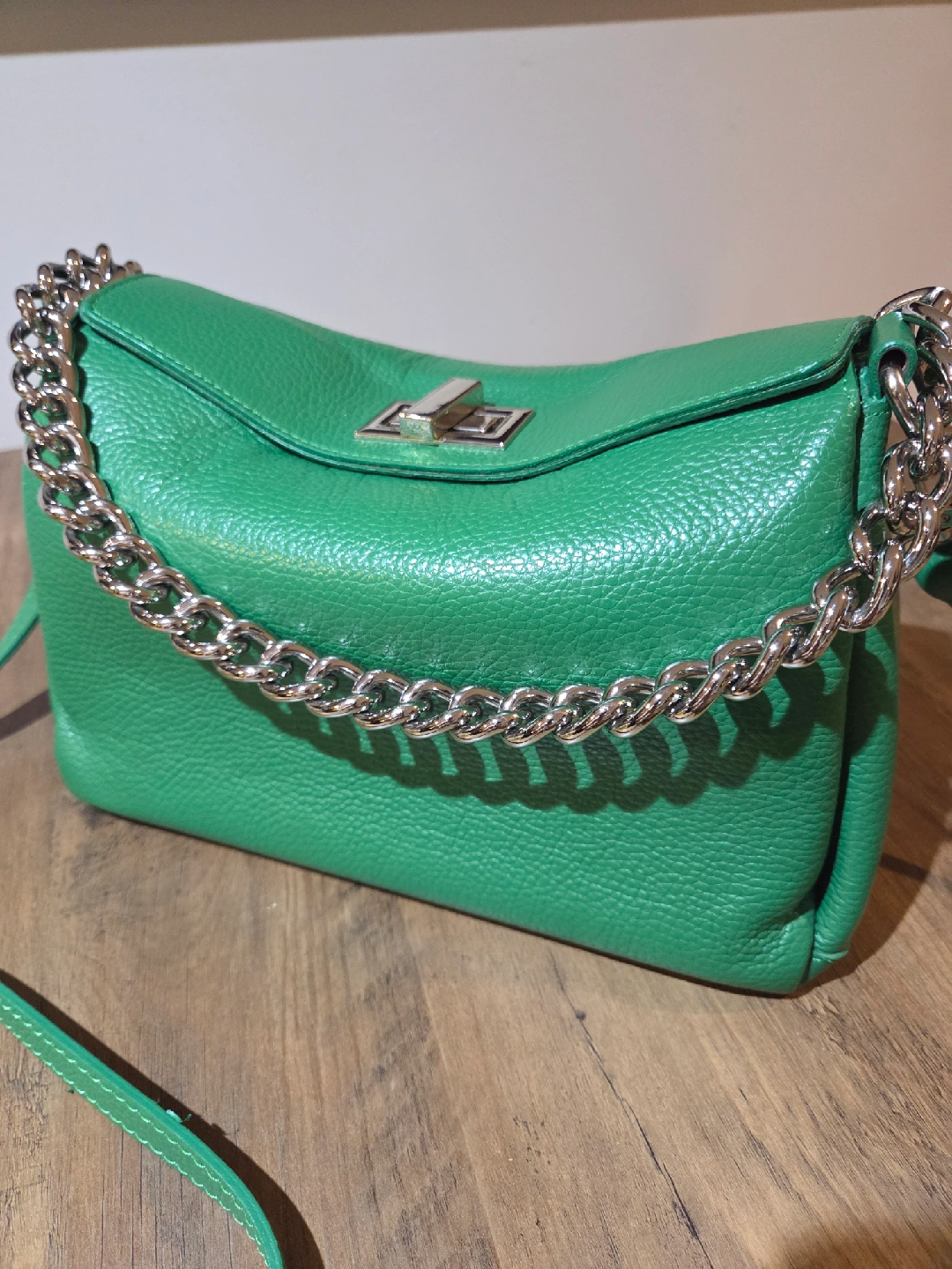 Selling a stylish green leather shoulder bag with a silver chain detai and detachable adjustable leather shoulder strap!