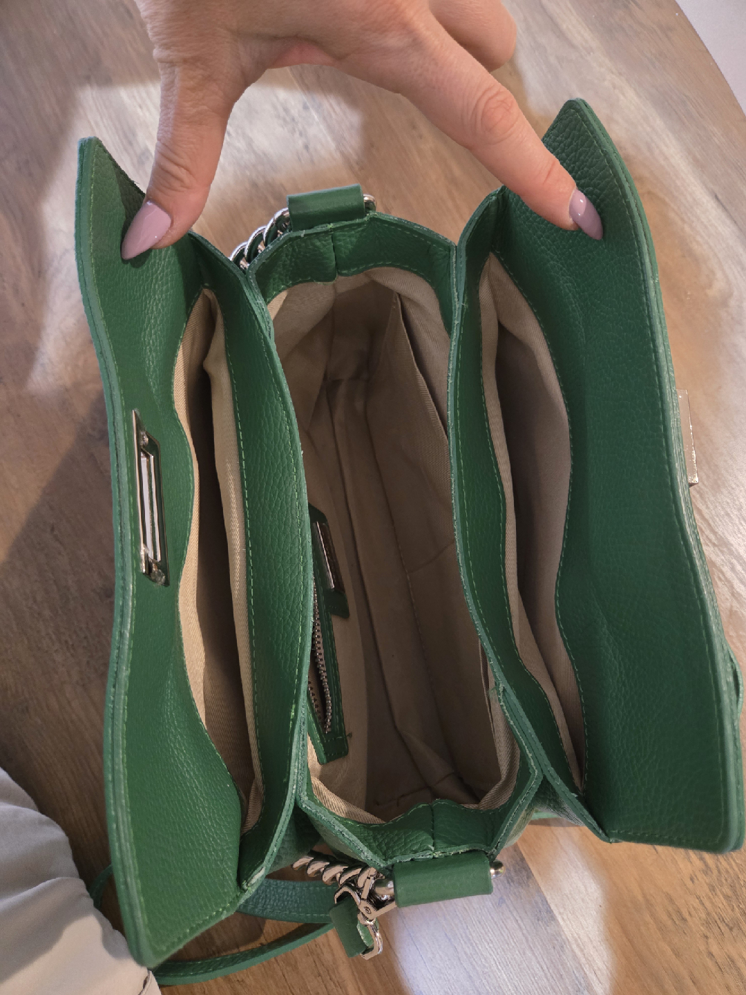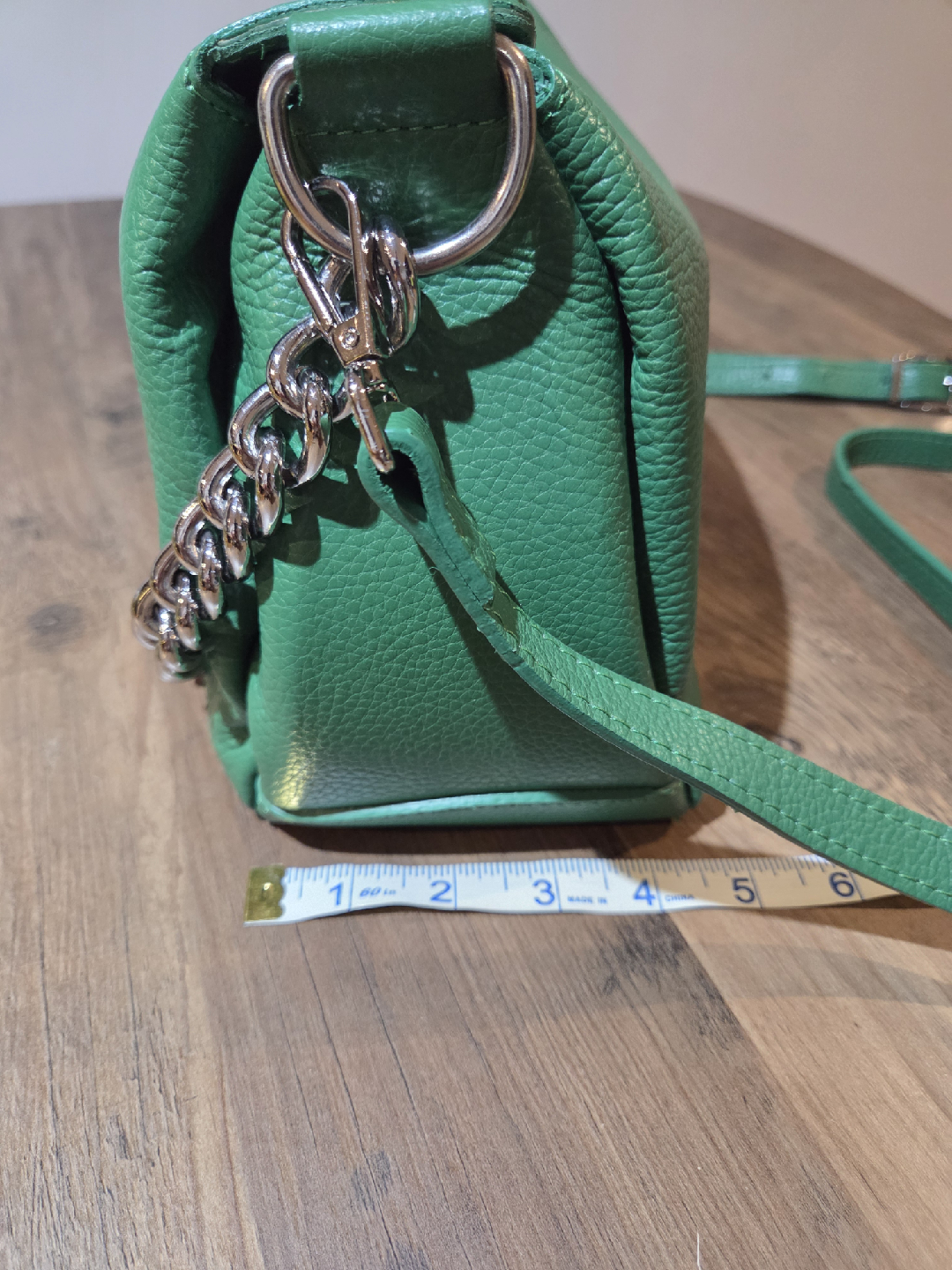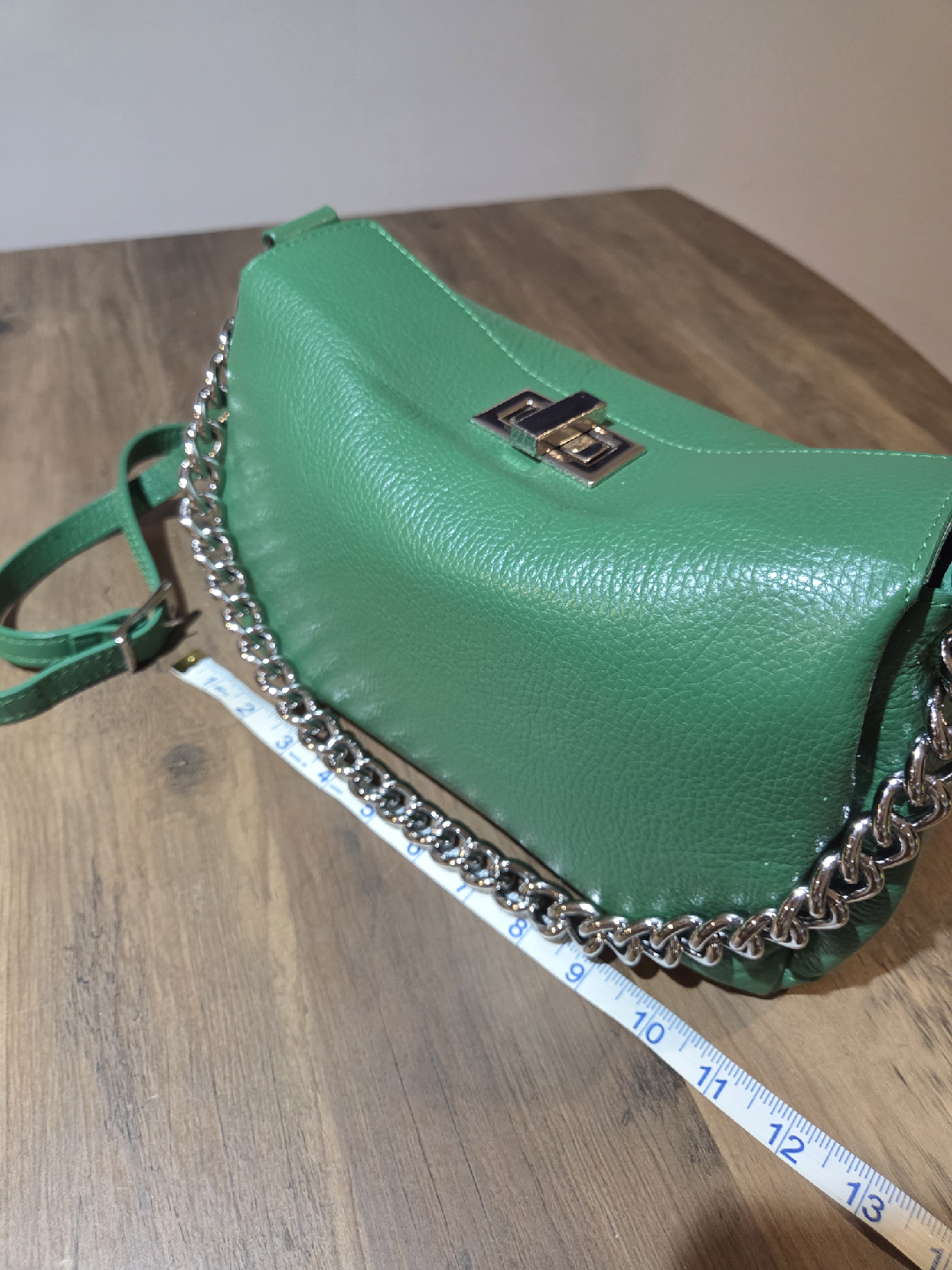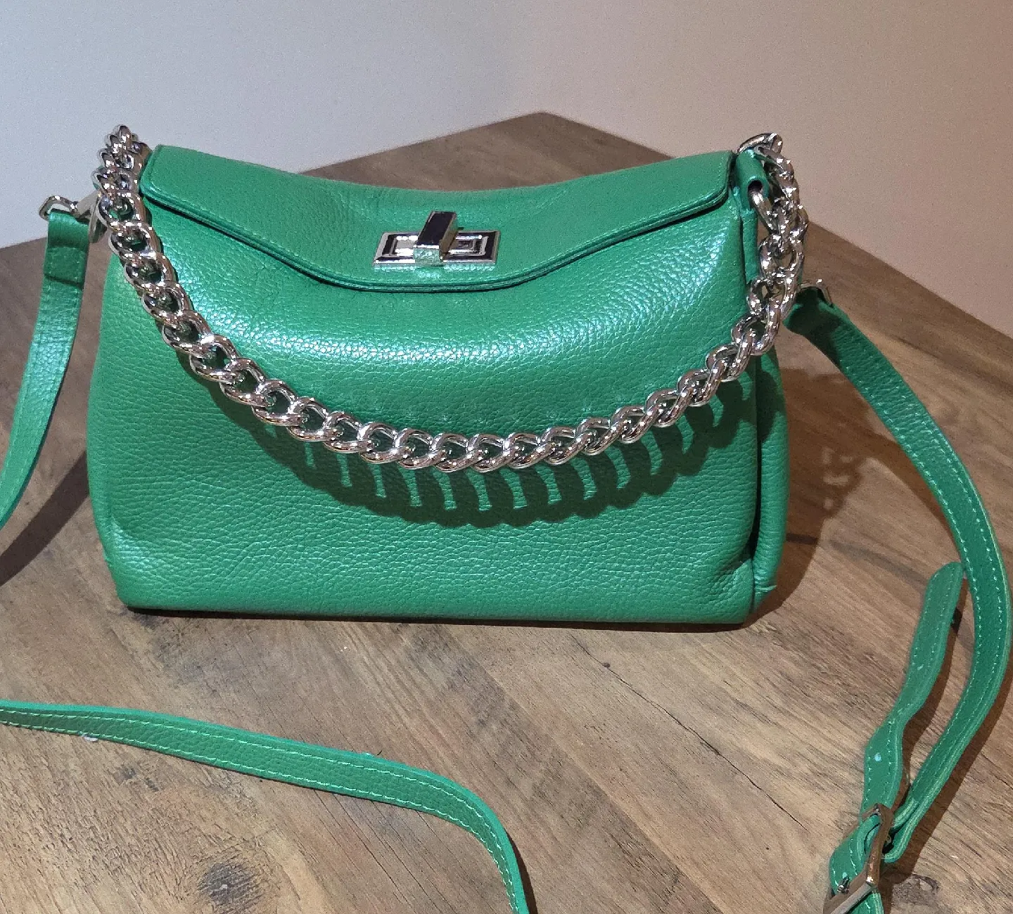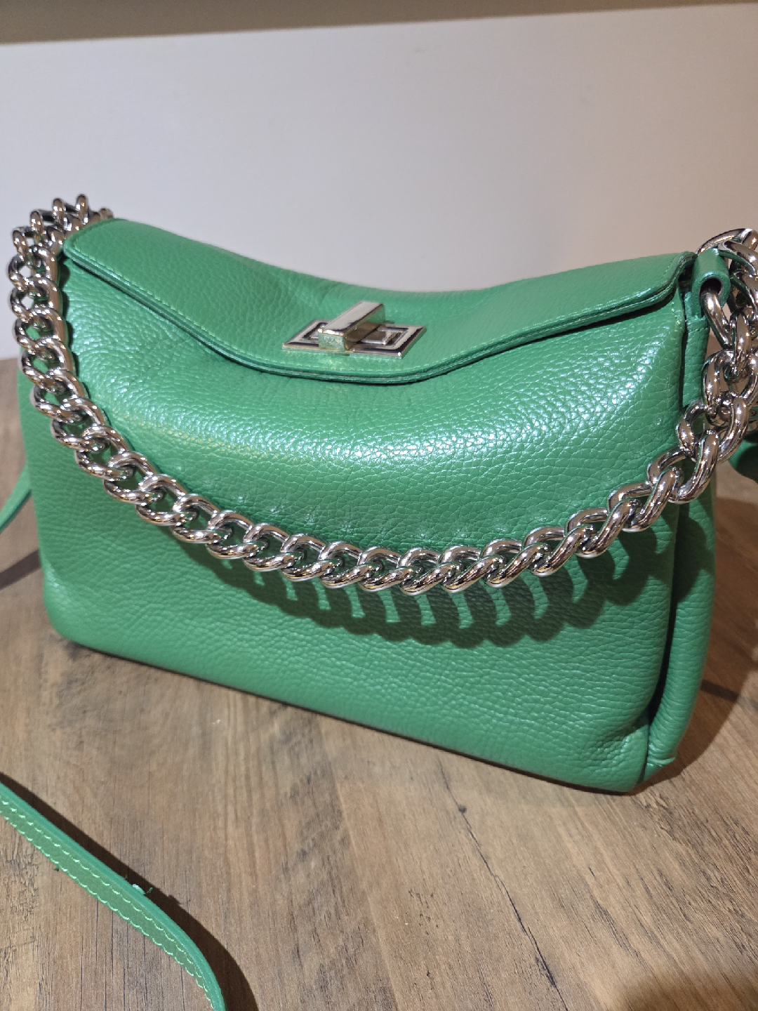 Selling a stylish green leather shoulder bag with a silver chain detai and detachable adjustable leather shoulder strap!