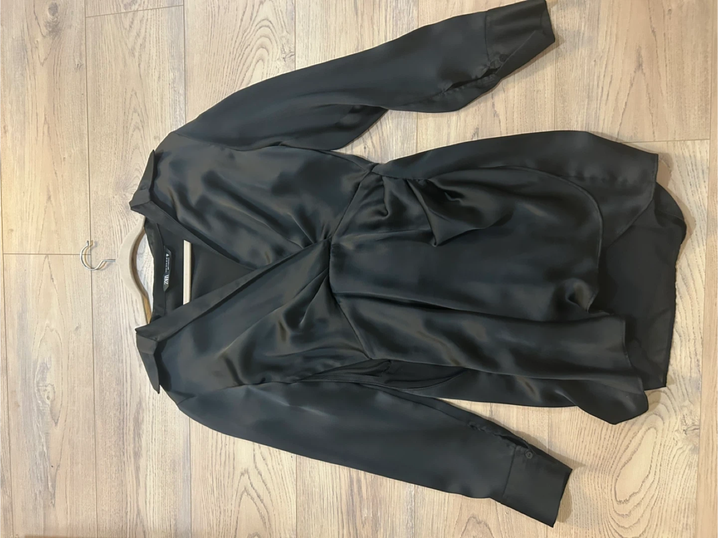 This is a ZARA black satin wrap dress. It's a size medium. The dress is made in Morocco. It features a flattering V-neckline and long sleeves with button cuffs.