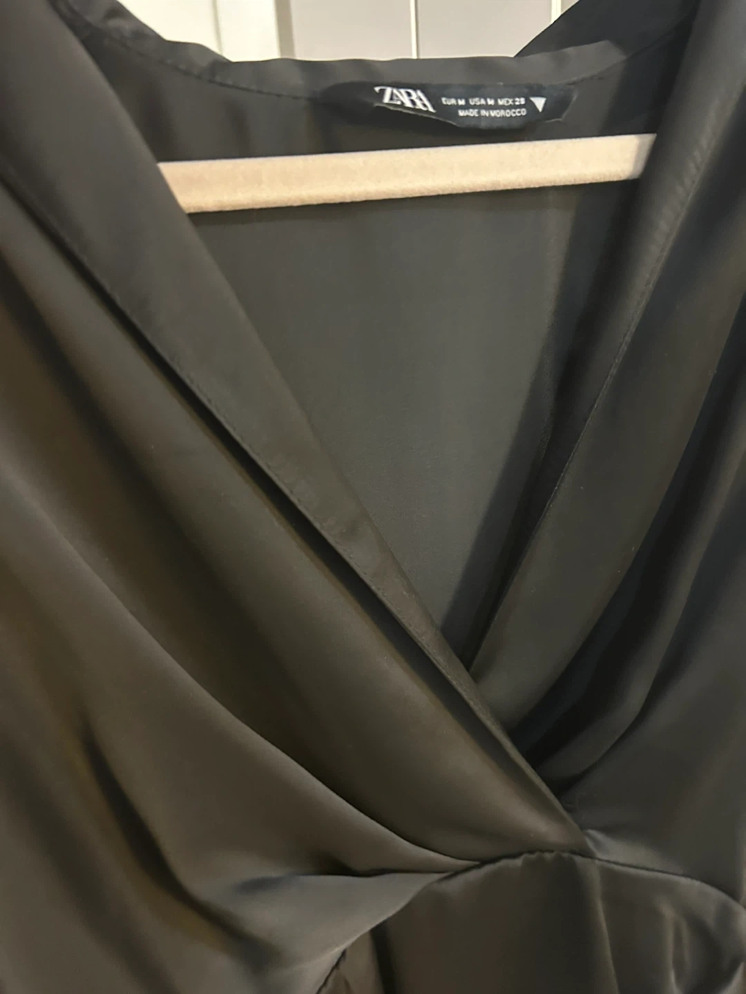 This is a ZARA black satin wrap dress. It's a size medium. The dress is made in Morocco. It features a flattering V-neckline and long sleeves with button cuffs.