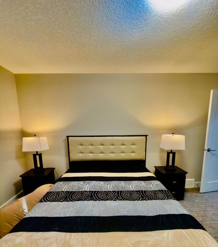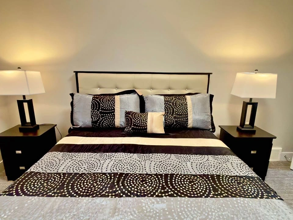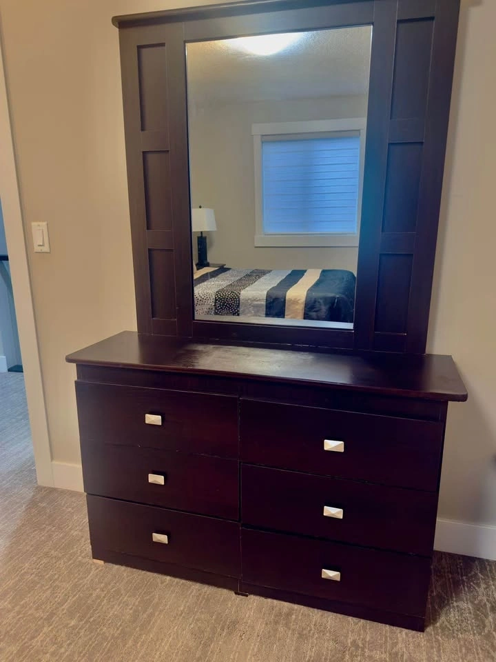 Beautiful modern luxury bedroom set in excellent used condition! Includes: Box storage bed (one side storage + 3 drawers), comfortable mattress, 2 matching nightstands, stylish dresser, and elegant tufted headboard. Gently used, clean & well maintained.