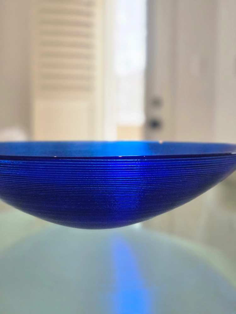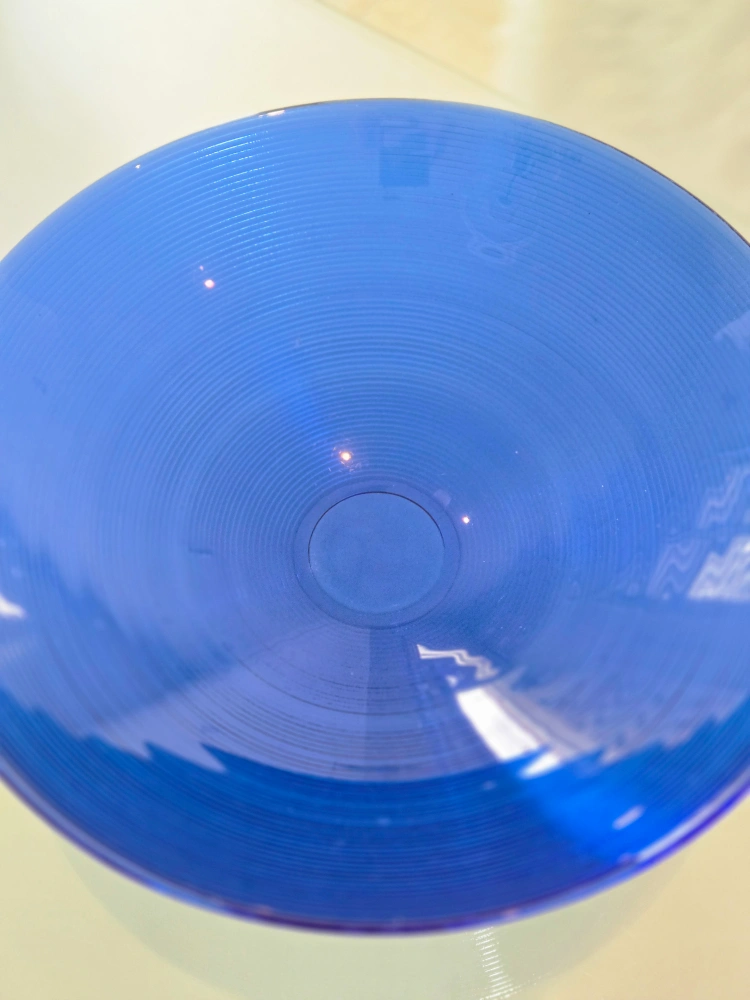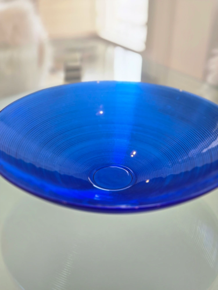 Large, cobalt blue glass bowl. Beautiful concentric lines throughout. Perfect for fruit, decorative accents, or a centerpiece. Unique and eye-catching.