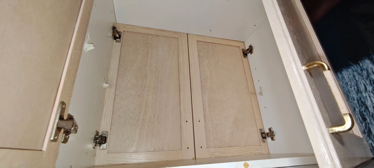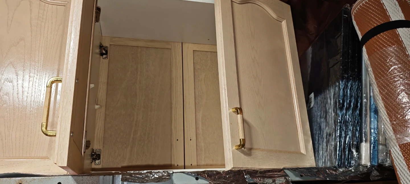 Four upper kitchen cabinets with a light oak finish and gold handles. Dimensions for left cabinets are 31.25"w*24"h*13.5"d, and for the right cabinet, they are 27.25"w*24"h*13.5"d. These cabinets offer ample storage space for your kitchen needs.