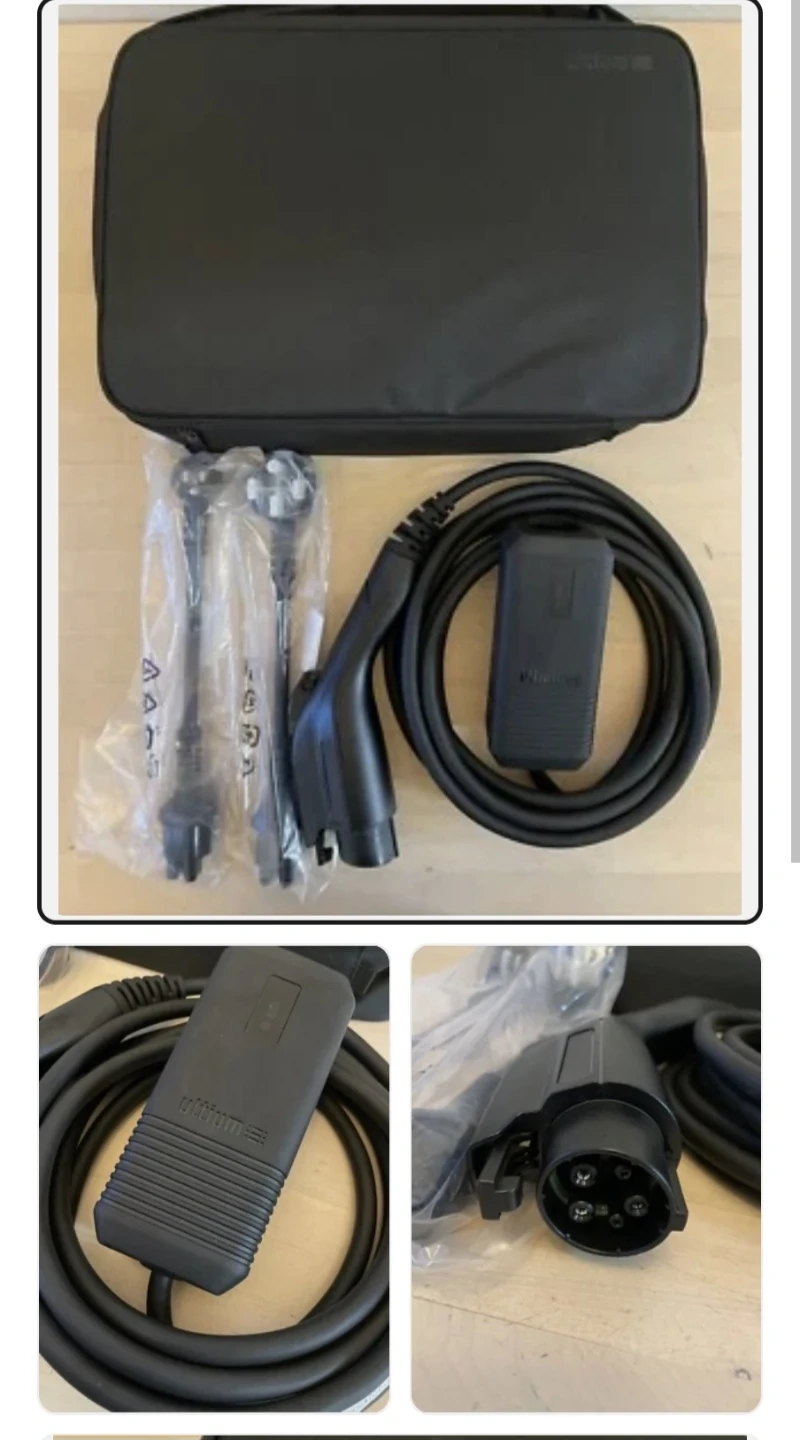 This is a EV charger cable with multiple plug adapters and a carrying case. It includes various adapters for different charging needs. The cable is black and comes with a zippered black case for storage and transport. New