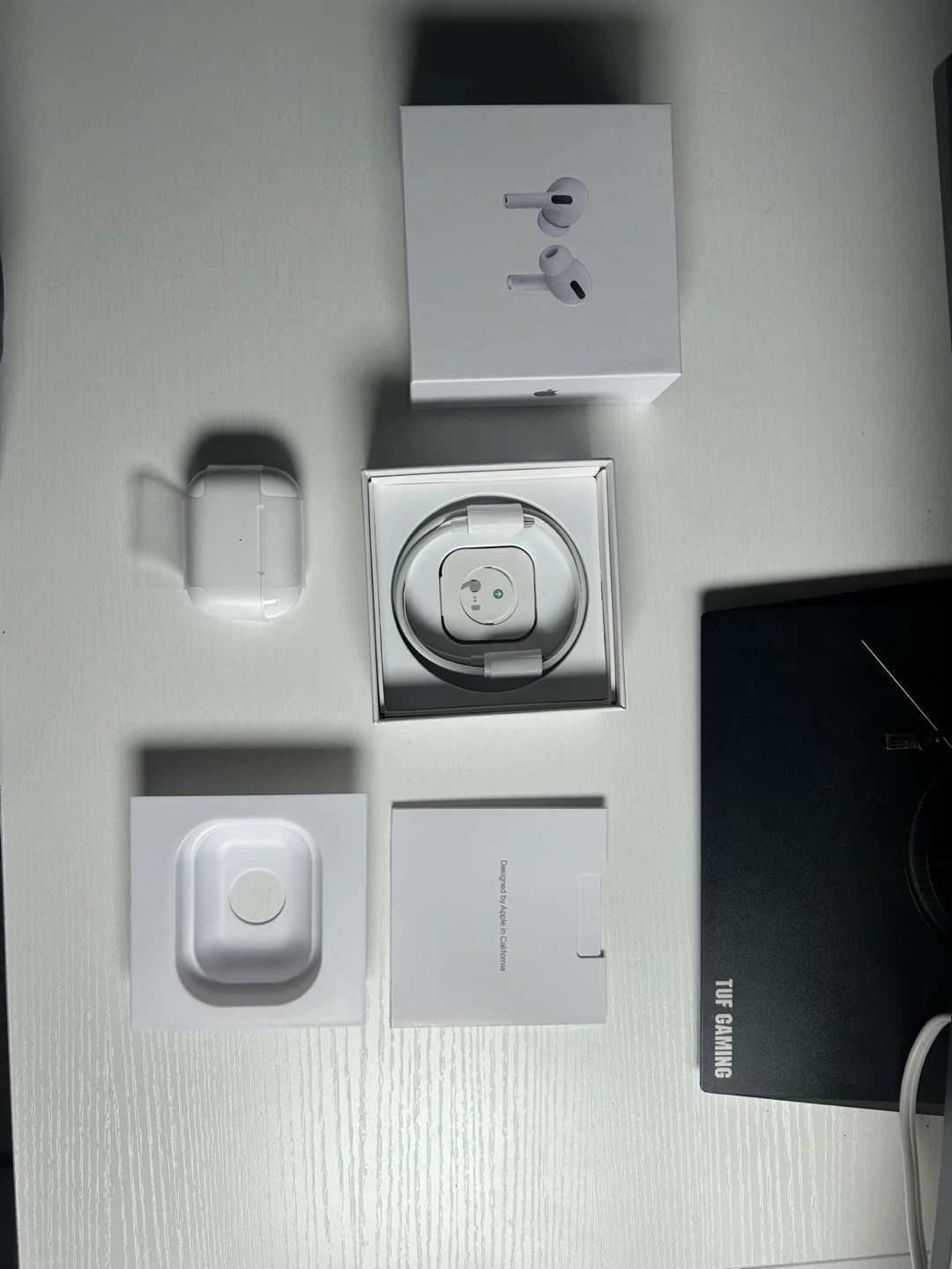 Apple AirPods Pro with MagSafe Charging Case. Includes original box and charging cable. Designed by Apple in California.