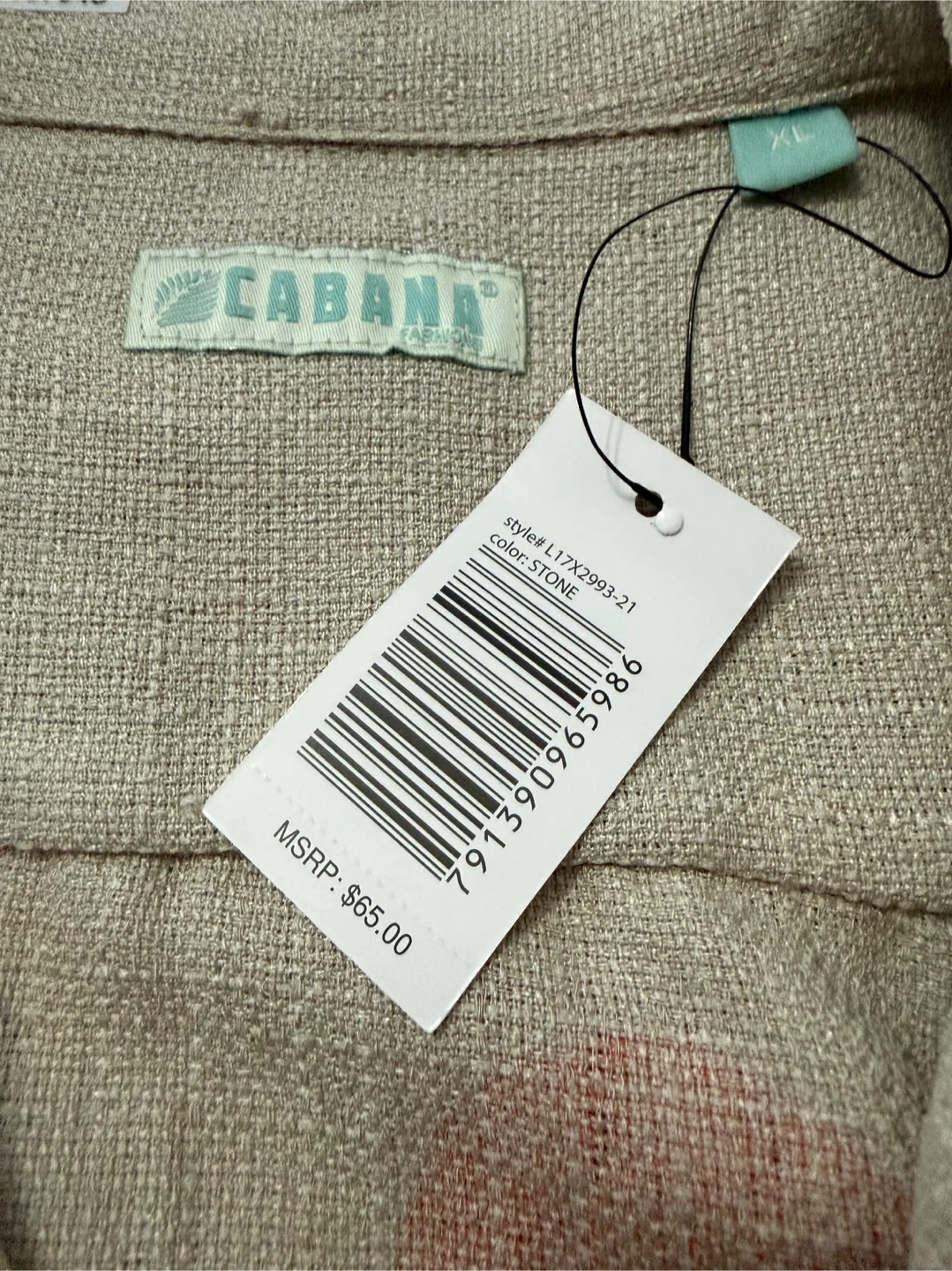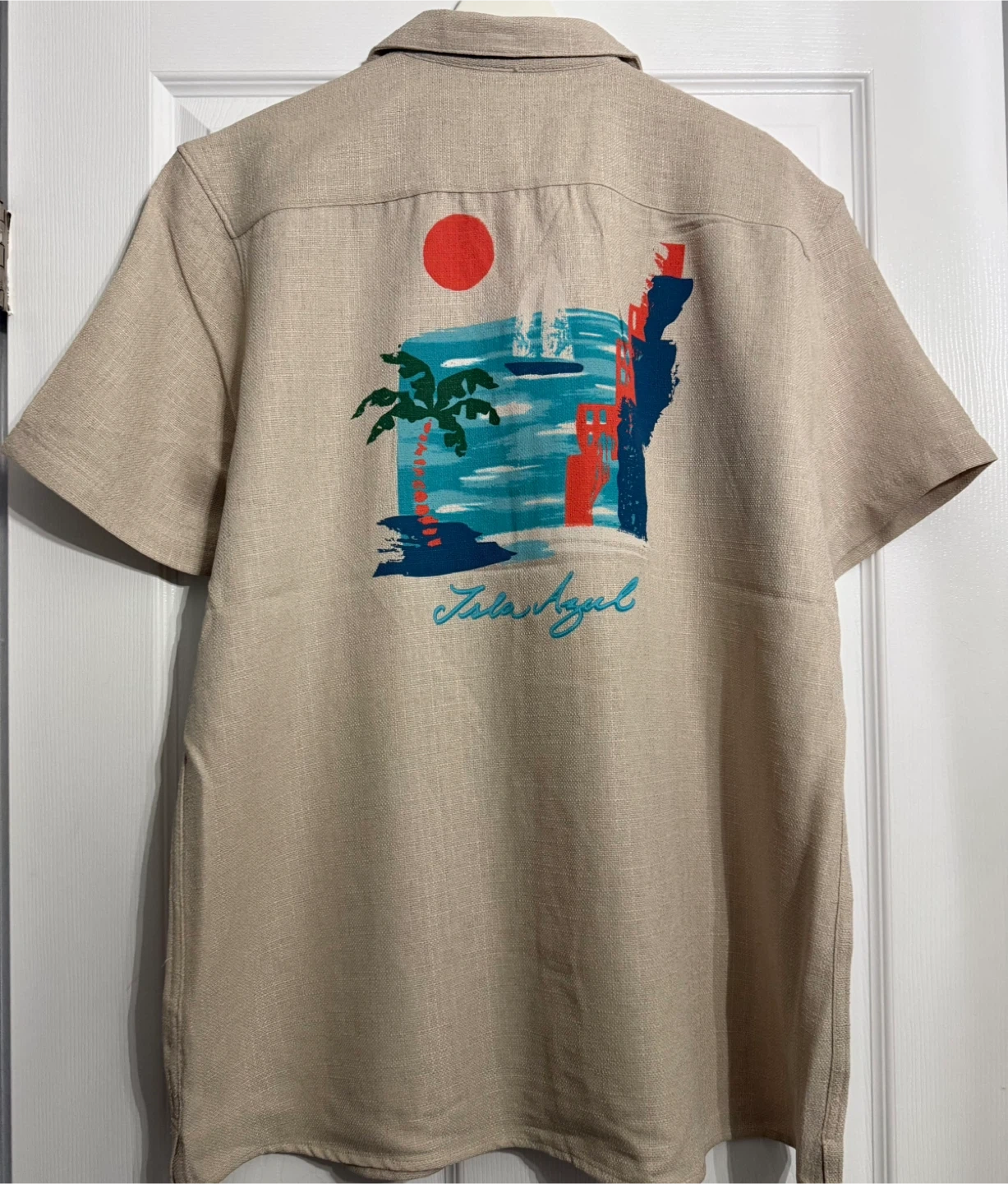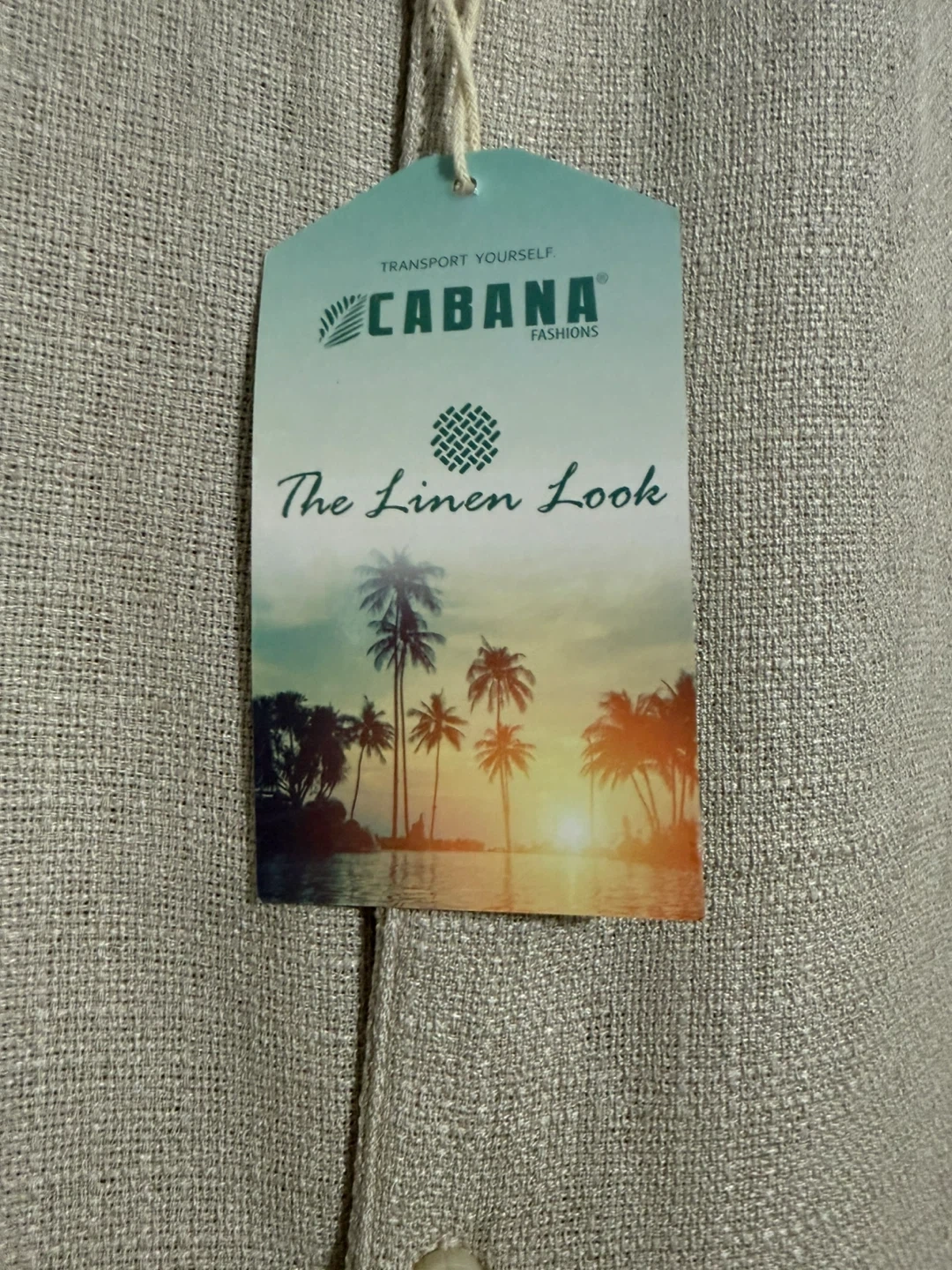 Cabana Fashions short sleeve button-up shirt in a stone colour. It's made of 100% polyester with a "The Linen Look" tag. Features a tropical graphic on the back. Size XL.