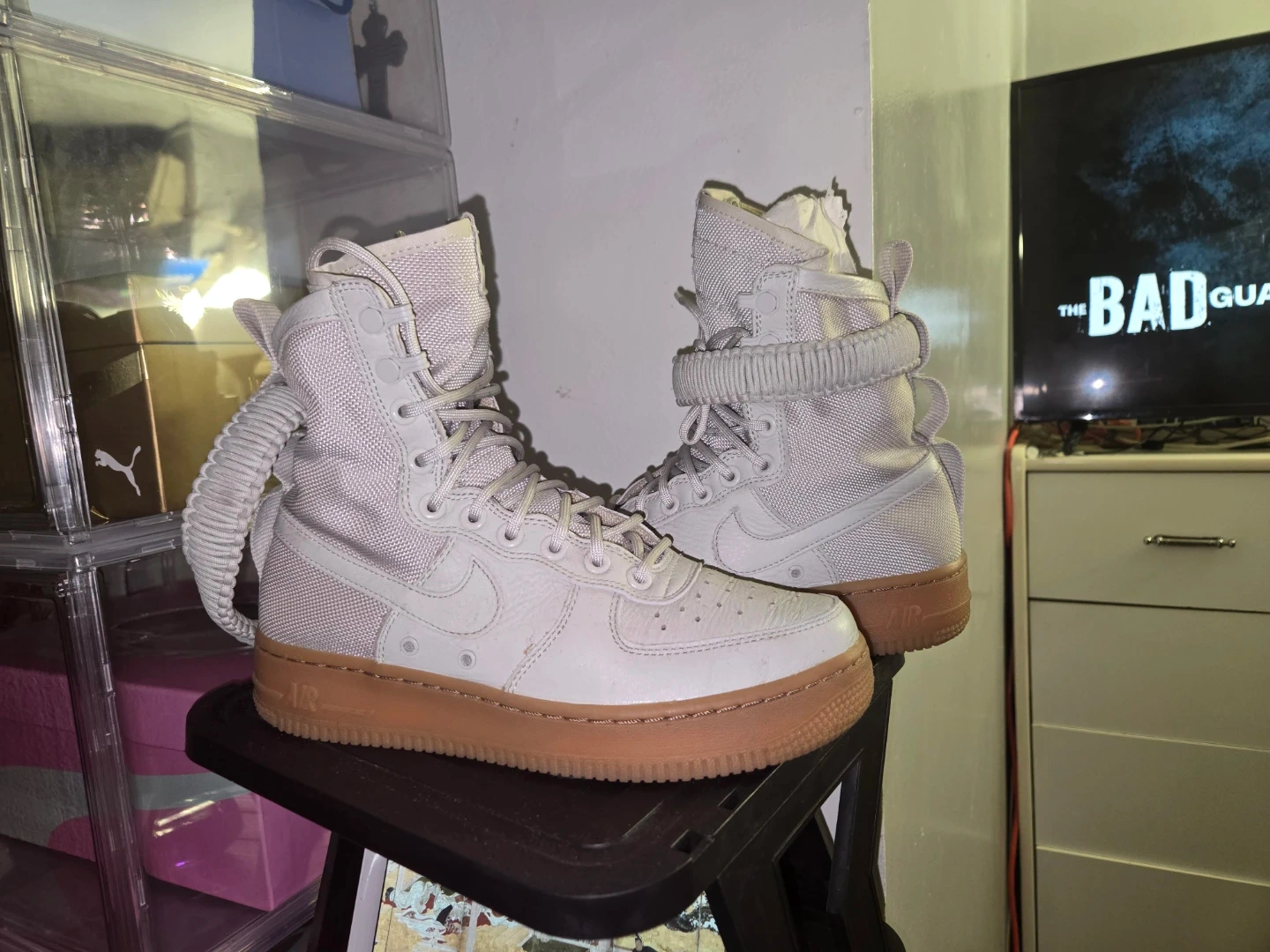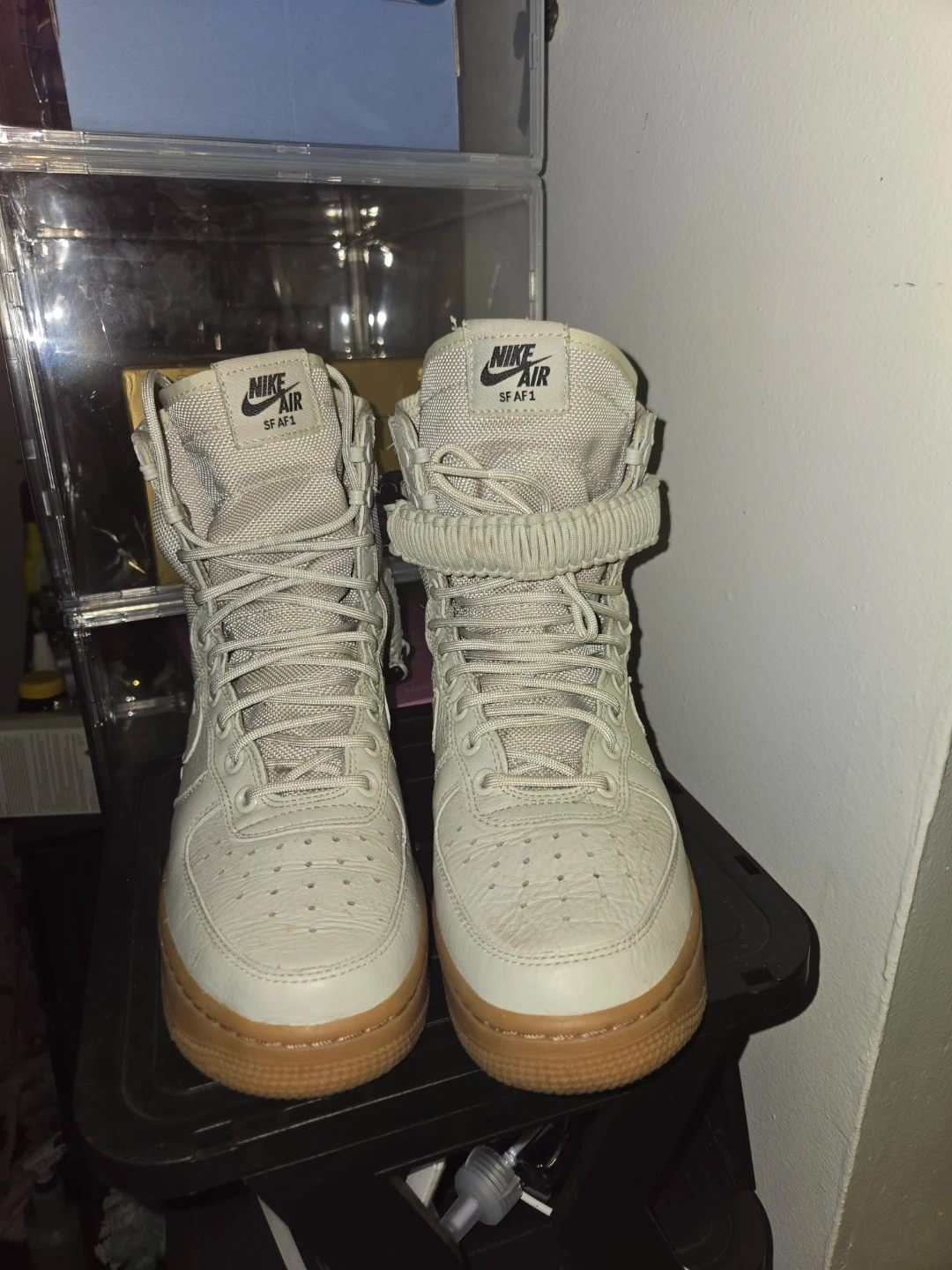 These are Nike SF AF1 high top sneakers. They're a light tan color with a gum sole. These sneakers have a unique lacing system and ankle strap for a secure fit. No box