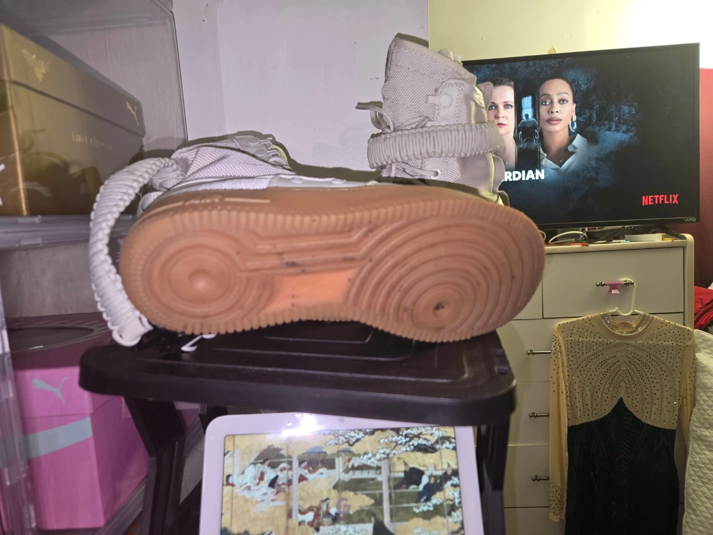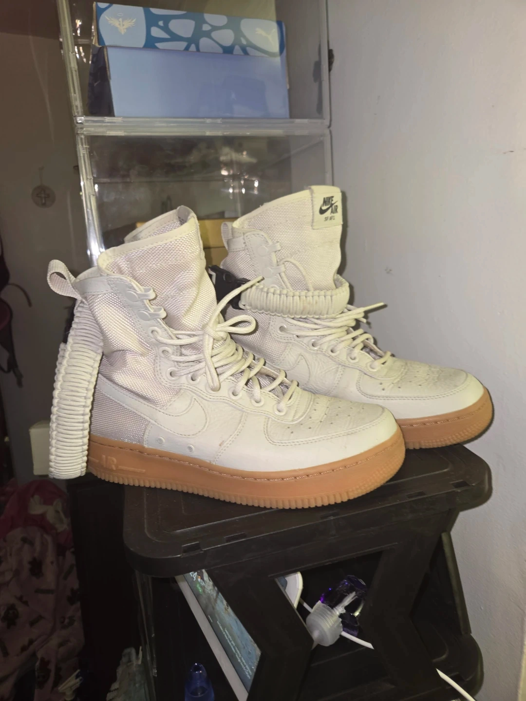 These are Nike SF AF1 high top sneakers. They're a light tan color with a gum sole. These sneakers have a unique lacing system and ankle strap for a secure fit. No box
