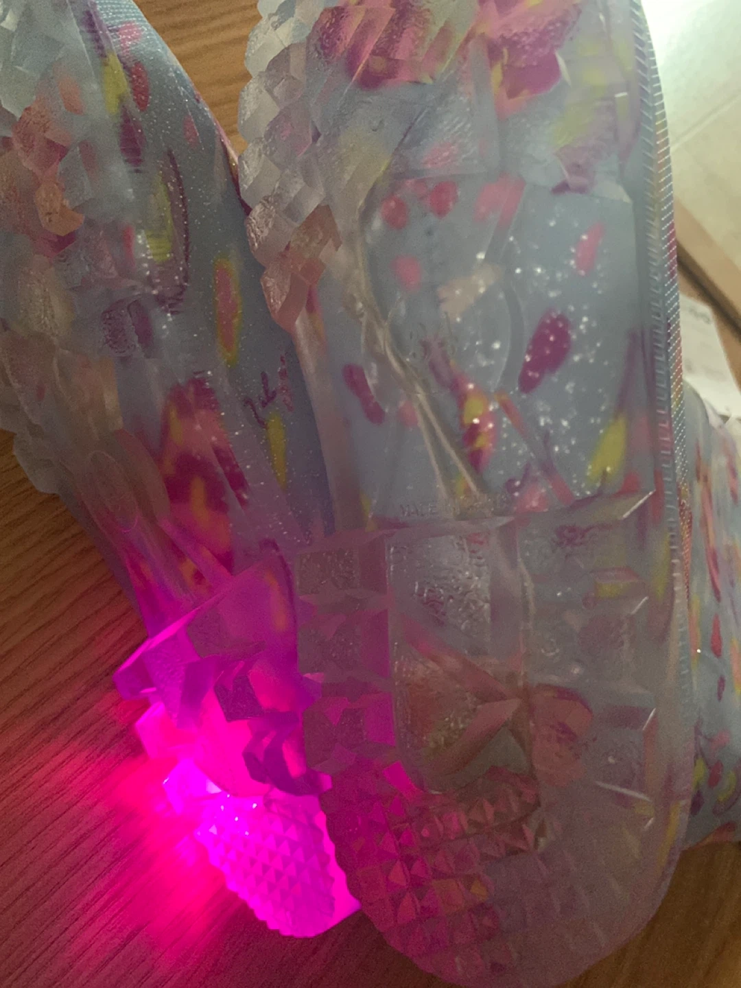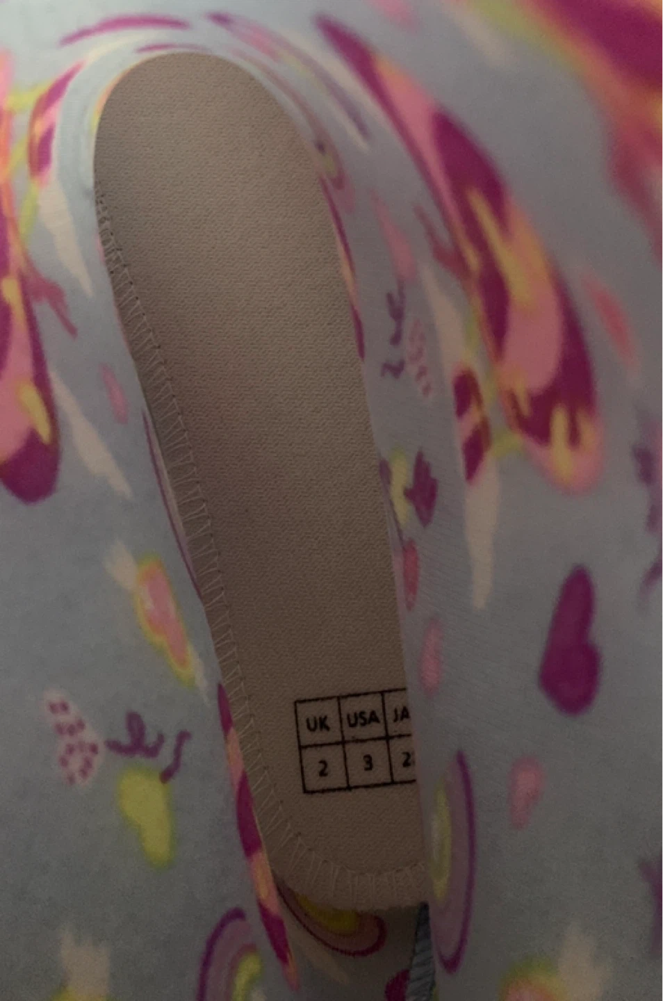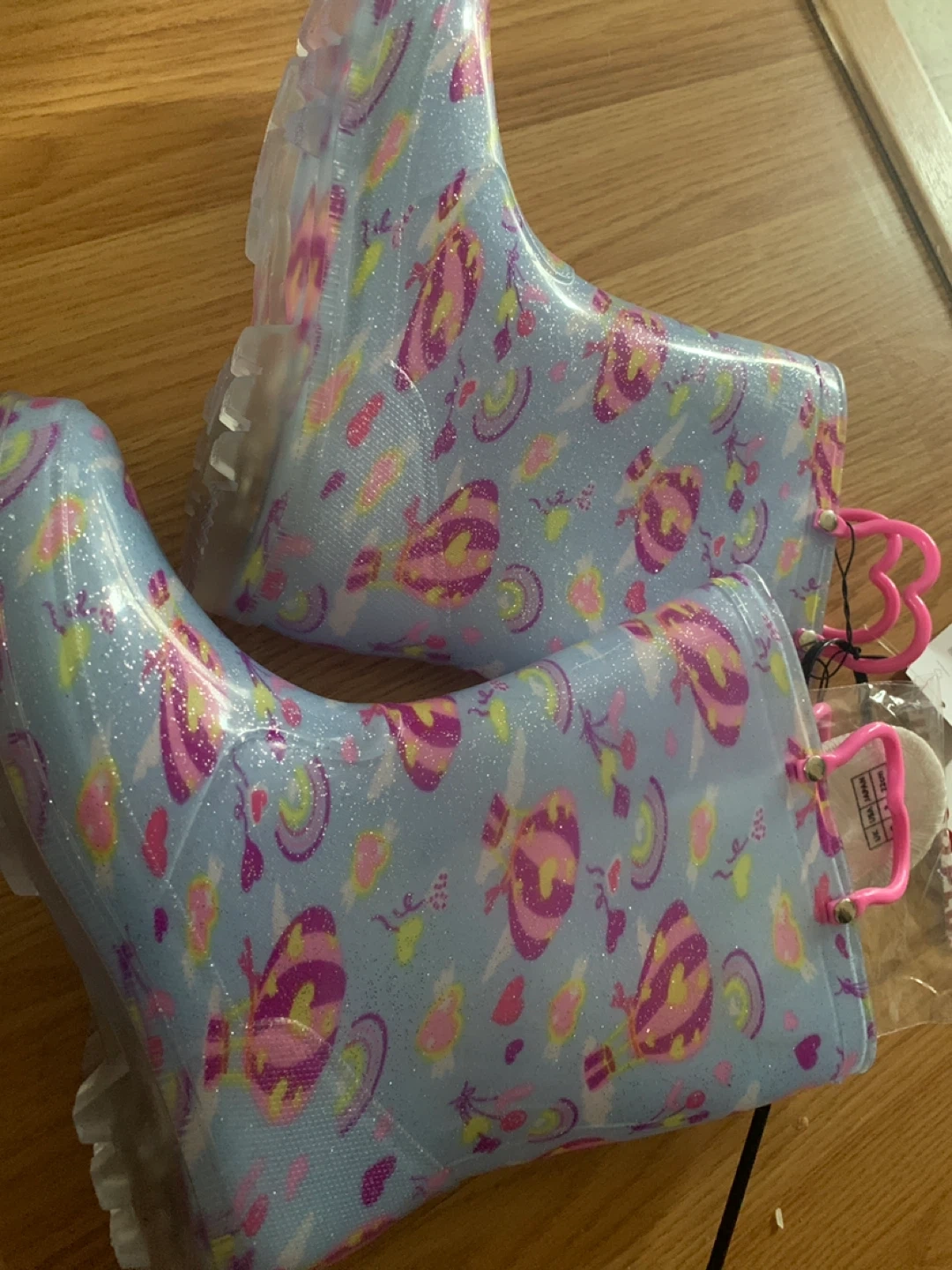 Girls' blue unicorn print rain boots with light-up soles. These boots are made of waterproof PVC material and feature a fun, colourful unicorn and rainbow design with glitter accents. Size 3 USA.