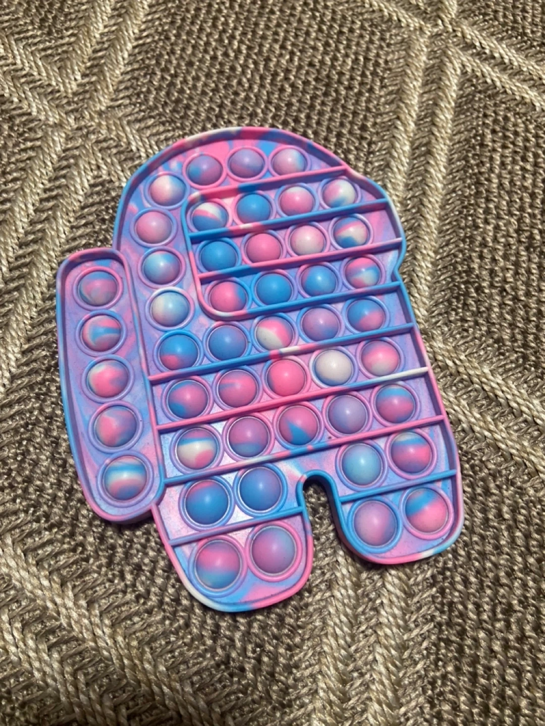 This is a pop-it fidget toy shaped like an Among Us character. It features a pink, blue, and purple tie-dye design. It's made of silicone and the condition is like new :)