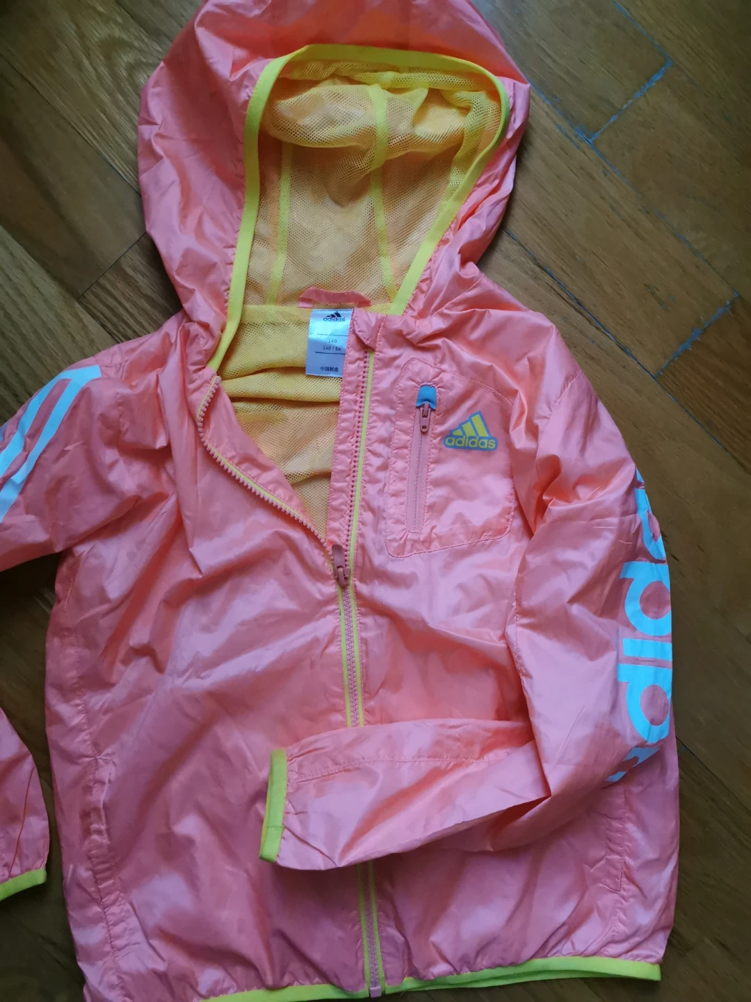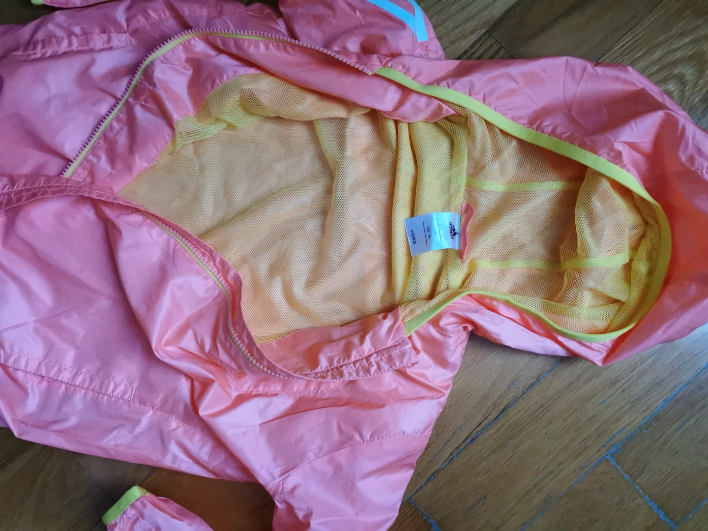This Adidas windbreaker is a fun pink colour with bright yellow accents. It's lightweight and has a hood, perfect for windy days. The jacket has the Adidas logo on the chest and sleeves.