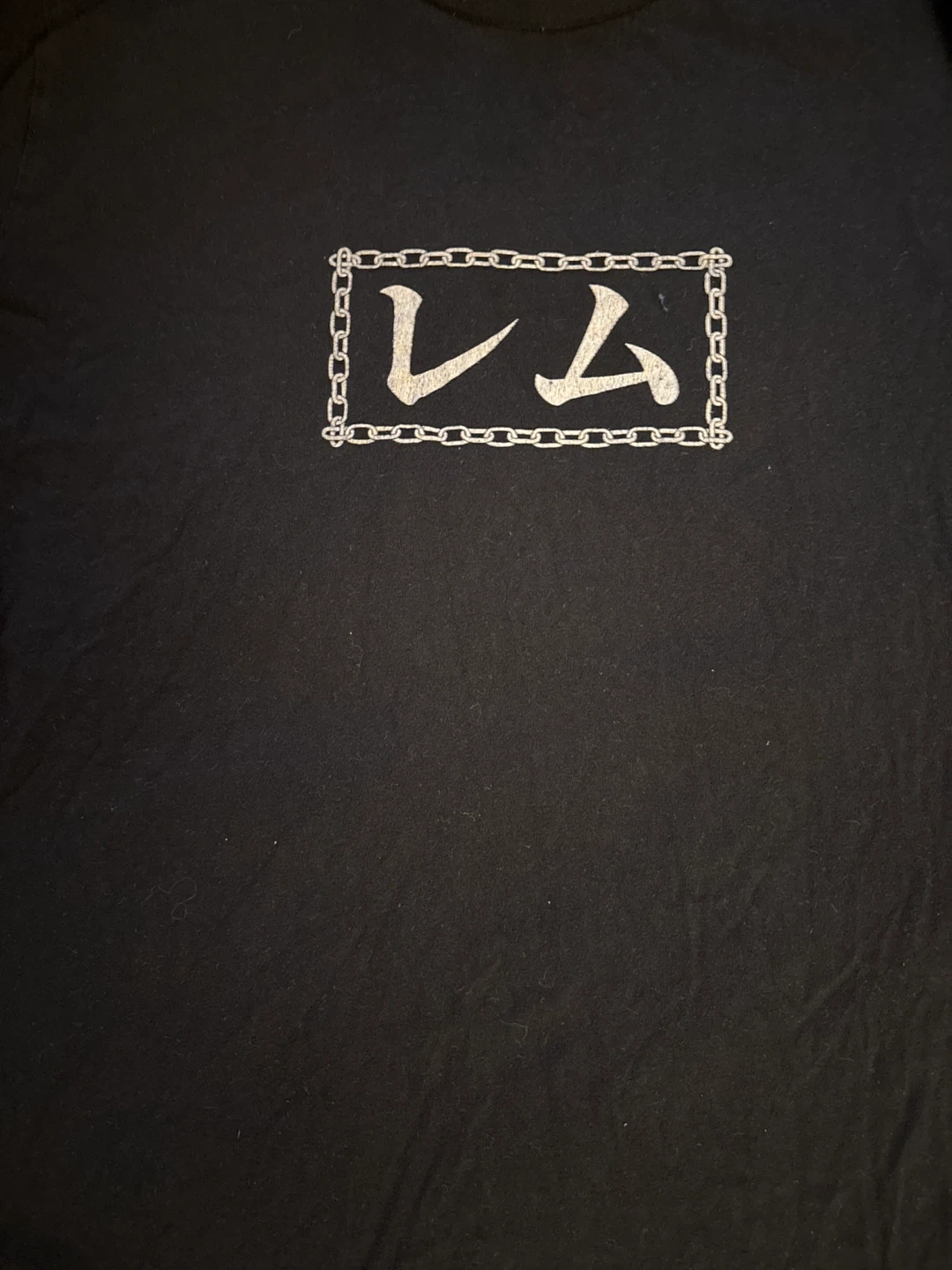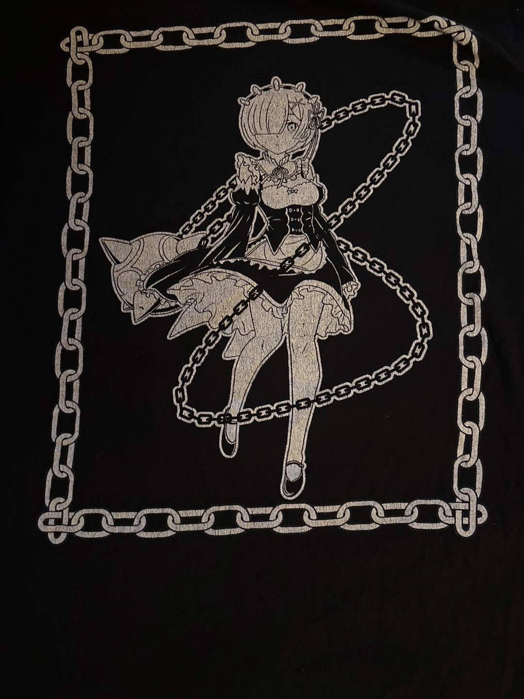 Selling a black t-shirt with an anime graphic. It has a unique design with a character and chain details. The shirt is in good condition and ready for a new home!