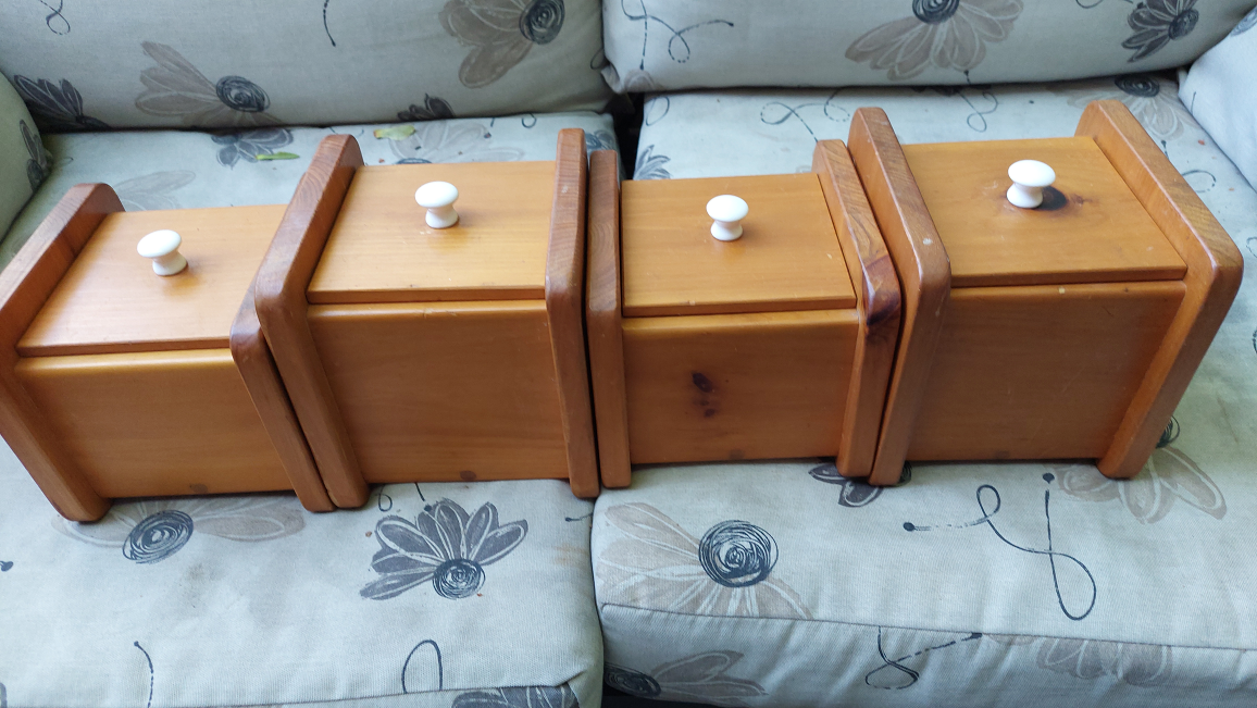 I'm selling a set of wooden kitchen canisters! They're in great condition and would look lovely in any kitchen. Each canister has a lid with a knob. Perfect for storing tea, sugar, coffee, or any other dry goods