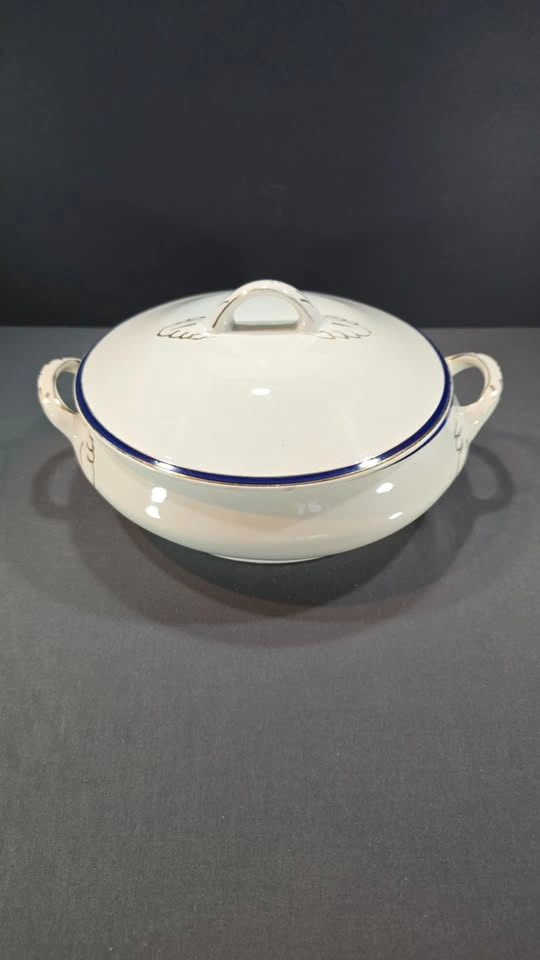 This covered vegetable tureen represents the practical elegance of British dining traditions, featuring clean lines and a simple blue-rimmed decoration that was popular in mid-century table settings.