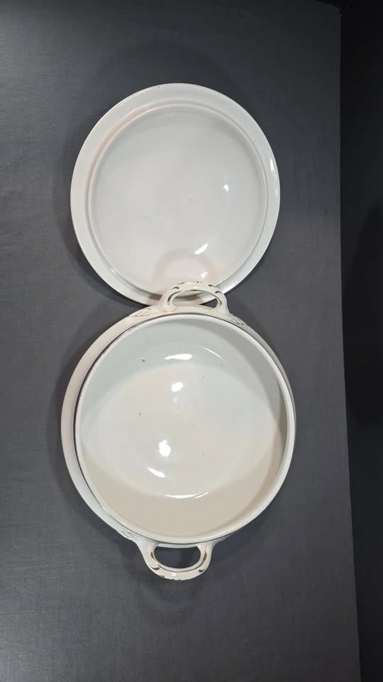 An elegant white enamel covered tureen with a striking blue rim and classic design. It's great for serving in timeless style or displaying as a charming kitchen collectible.