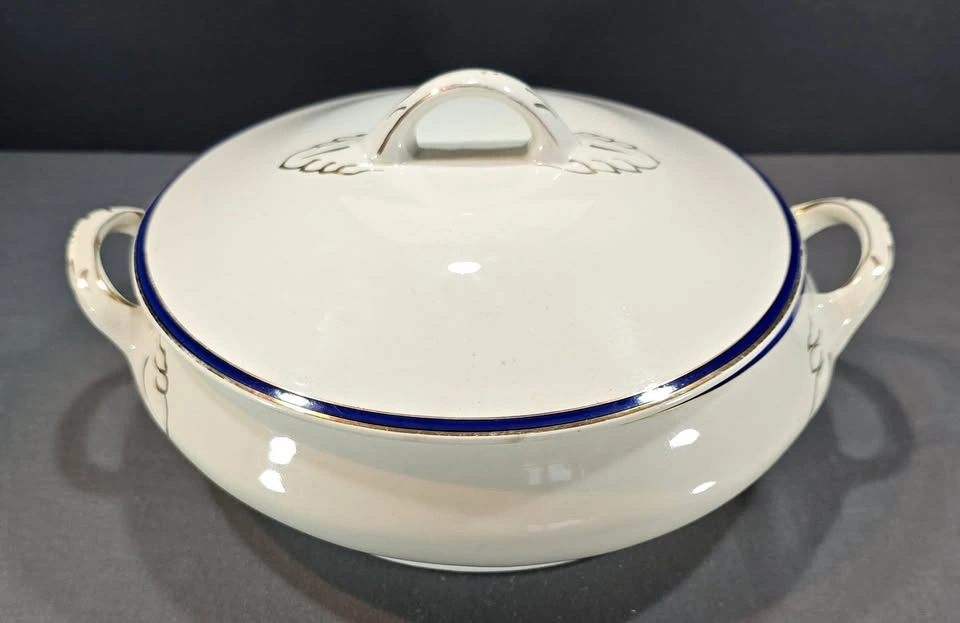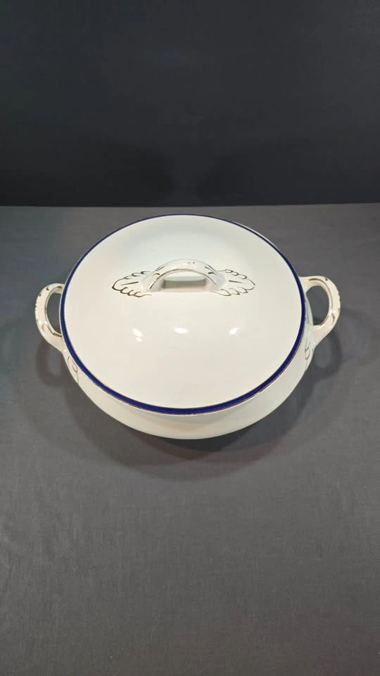 This covered vegetable tureen represents the practical elegance of British dining traditions, featuring clean lines and a simple blue-rimmed decoration that was popular in mid-century table settings.