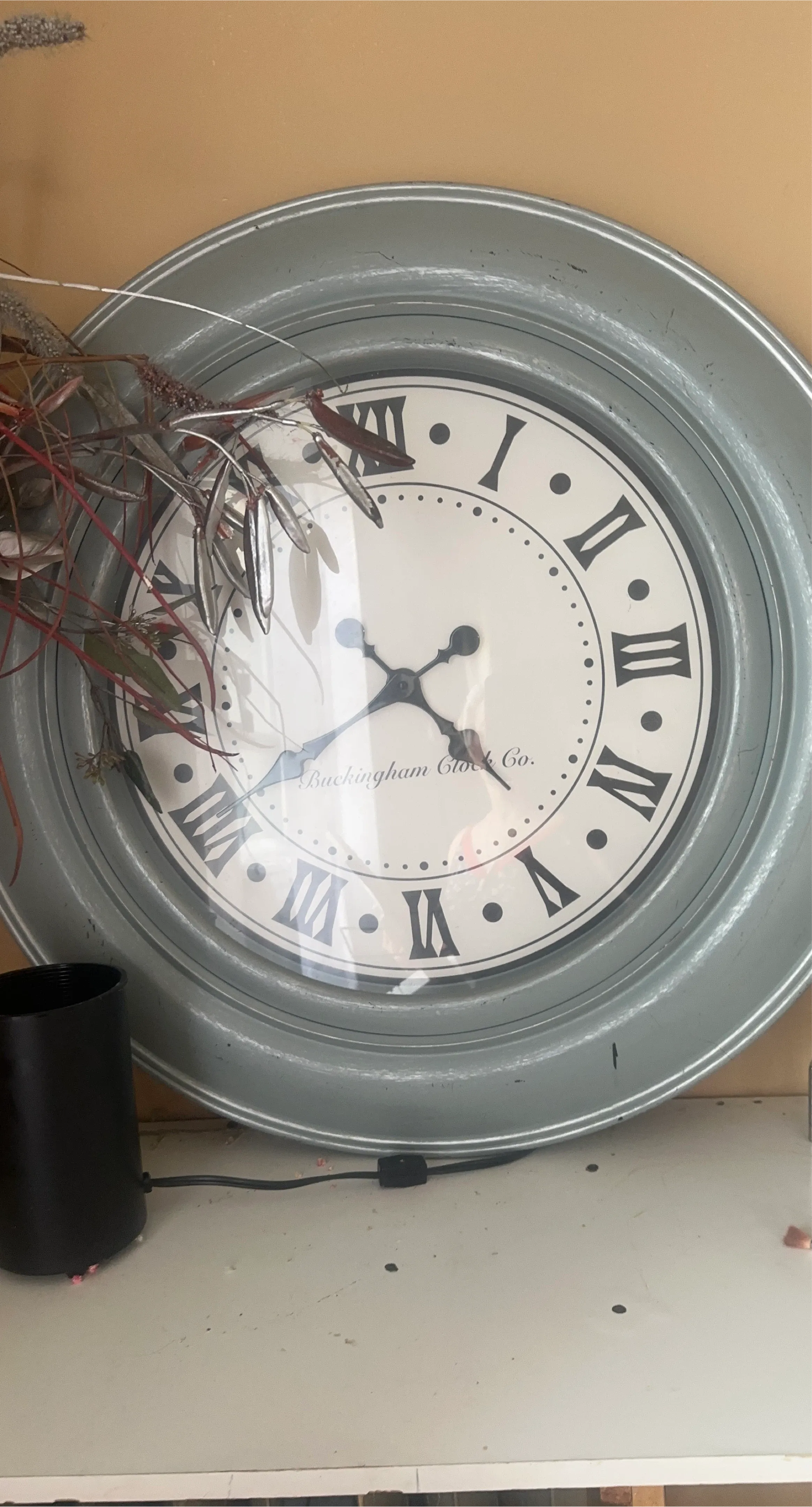 This is a Buckingham Clock Co. wall clock. It features a gray frame and a white face with Roman numerals. It's a nice addition to any room!