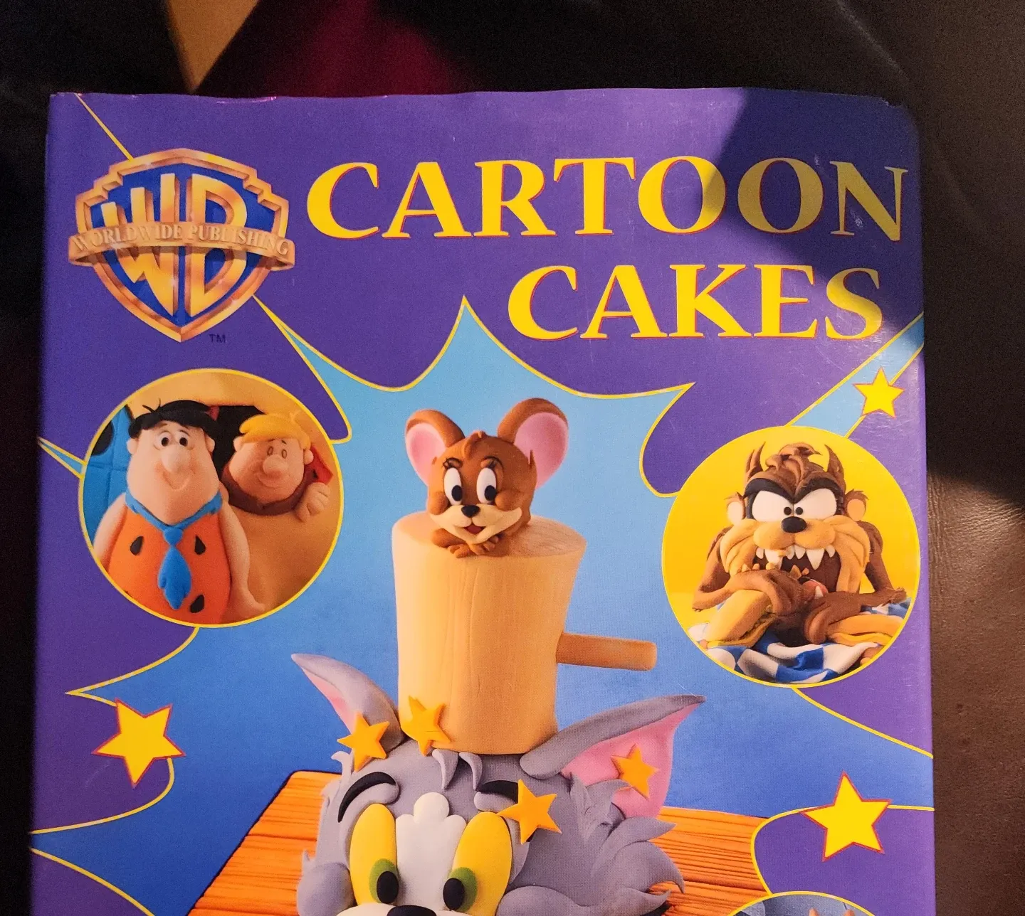 This is a book titled Cartoon Cakes. It features designs for cakes inspired by characters like Tom, Jerry, the Flintstones, and Tazmanian Devil. It's a great resource for baking enthusiasts! Warner Bros. Worldwide Publishing.