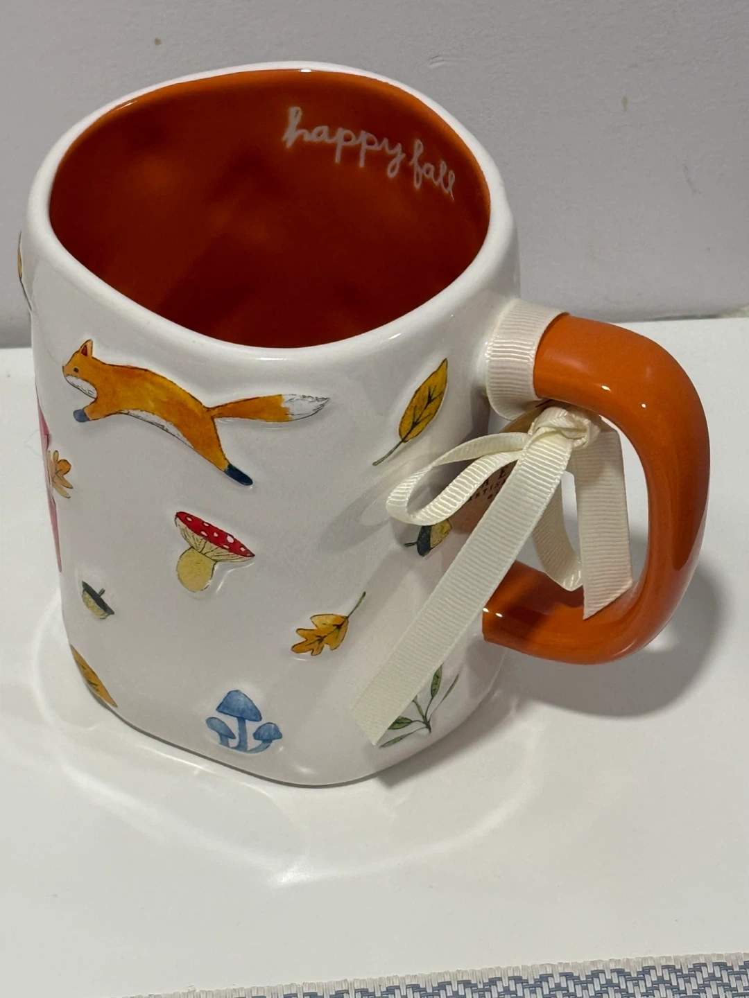 This Rae Dunn mug features a playful fox design with fall leaves and mushrooms. It says "happy fall" inside and has a bright orange handle. Dishwasher safe.