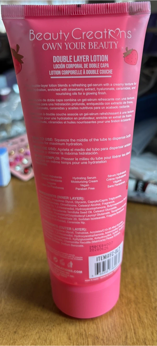 This is a Beauty Creations Double Layer Lotion with a hydrating serum. It's enriched with strawberry extract, hyaluronic, ceramides, and nourishing oils. It contains 200ml (6.76 fl oz) of product.