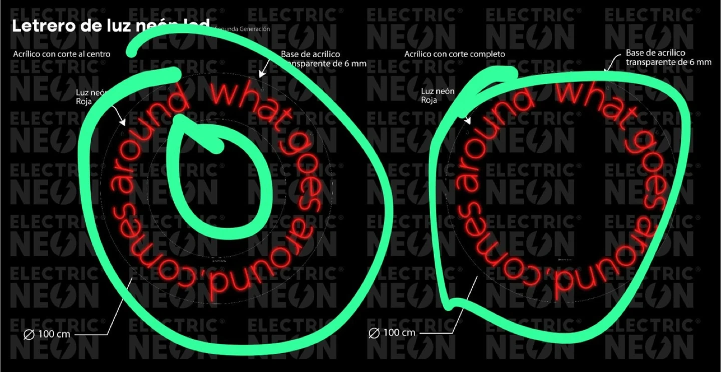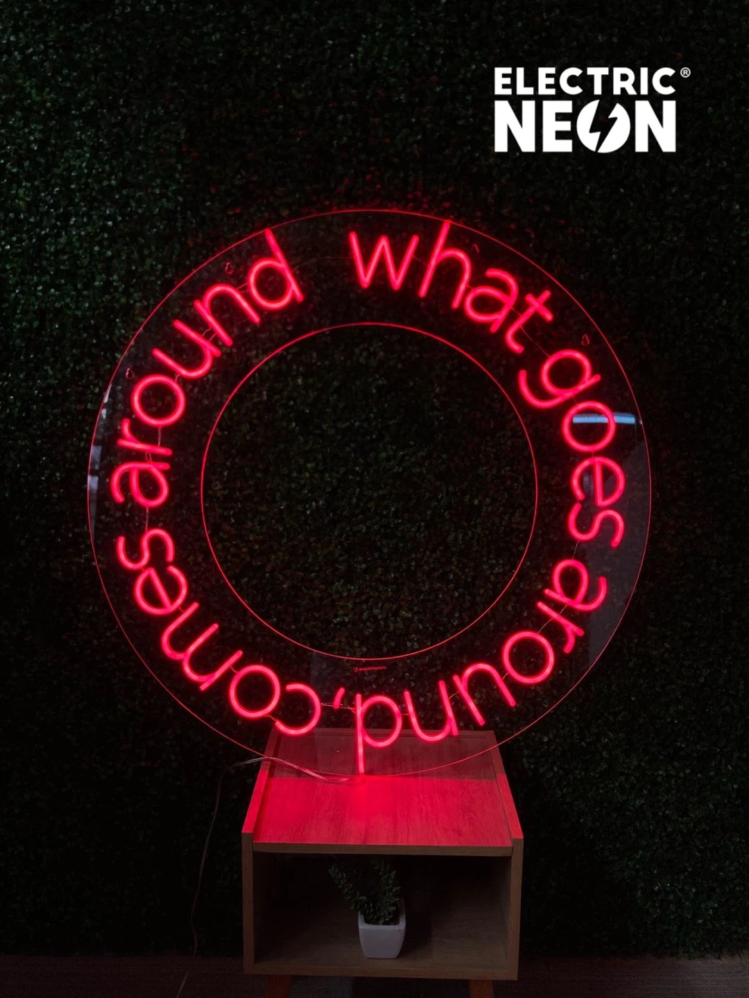 Add a cool vibe to your space with this led Neon sign! It features the phrase 'What goes around comes around' in a vibrant red neon light. The sign is 100 cm in diameter and made with a clear acrylic base. Perfect for a bedroom, living room, or even a home office