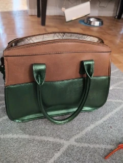 This is a brown and Metallic green handbag. It has two top handles and a top zipper closure. There's a small charm hanging from one of the handles. Comes with shoulder strap. Excellent condition - killer style.