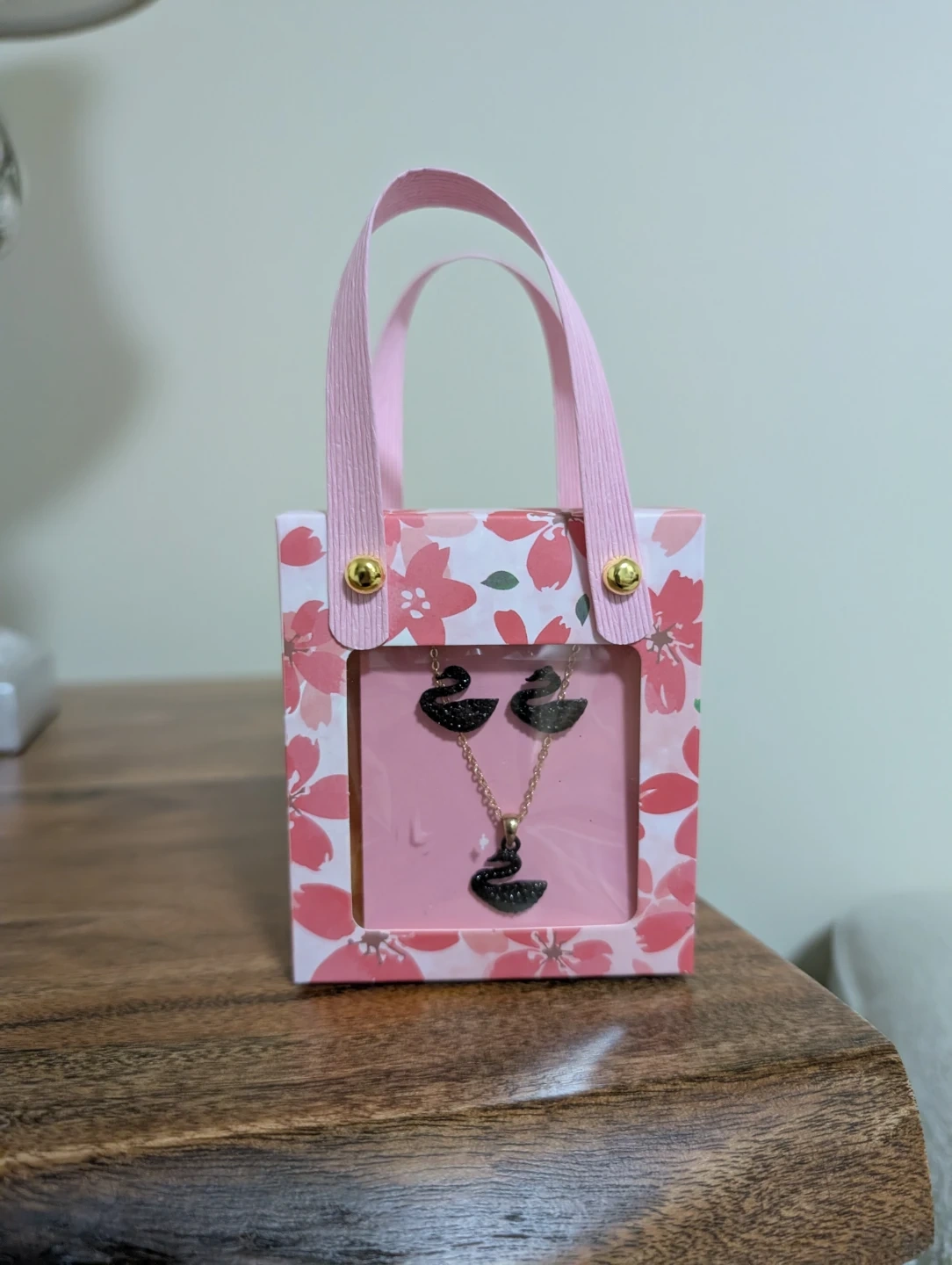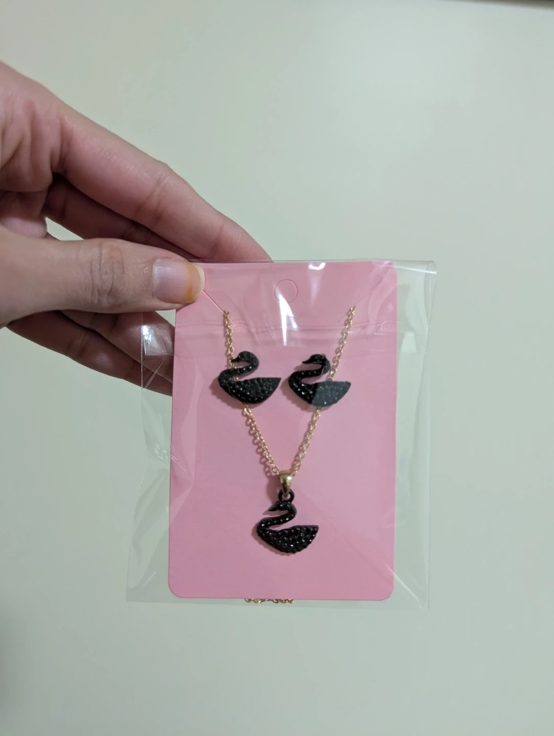 This is a gold-toned bracelet featuring a black swan charm encrusted with black rhinestones. It also includes a matching necklace and stud earrings, all with black swan pendants. There's also a teddy candle and cute hair clip. The set comes in a decorative gift box.