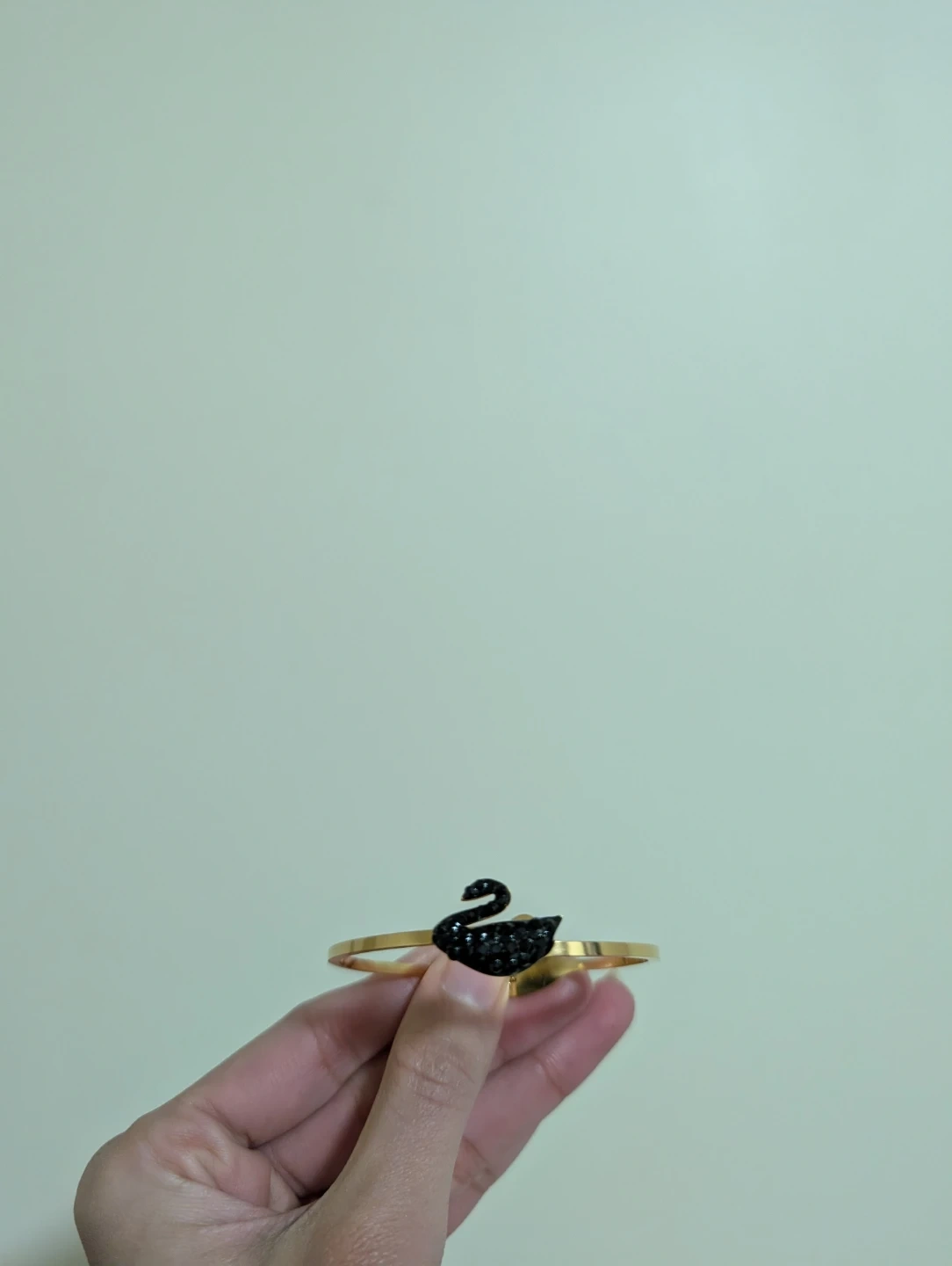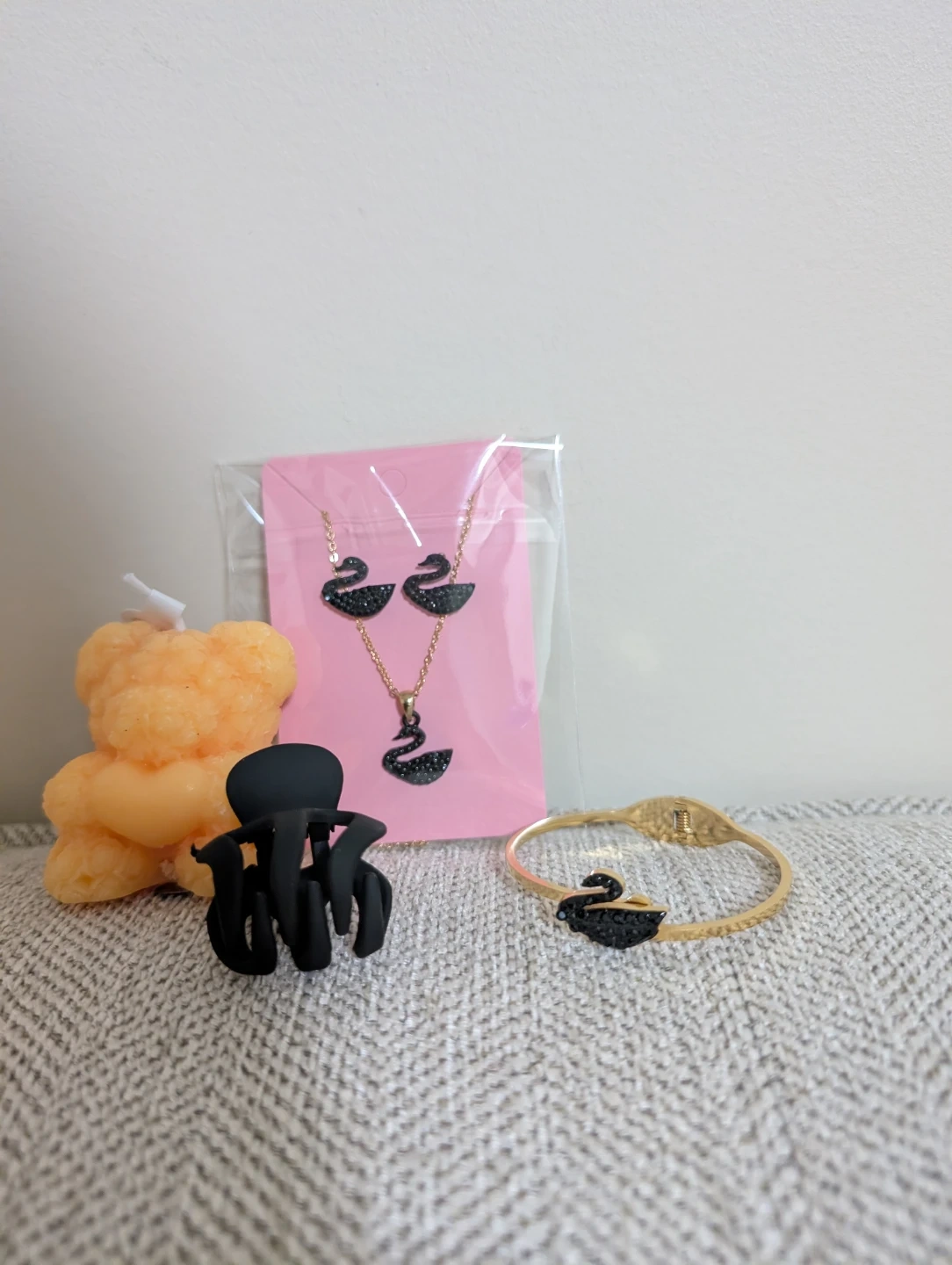 This is a gold-toned bracelet featuring a black swan charm encrusted with black rhinestones. It also includes a matching necklace and stud earrings, all with black swan pendants. There's also a teddy candle and cute hair clip. The set comes in a decorative gift box.