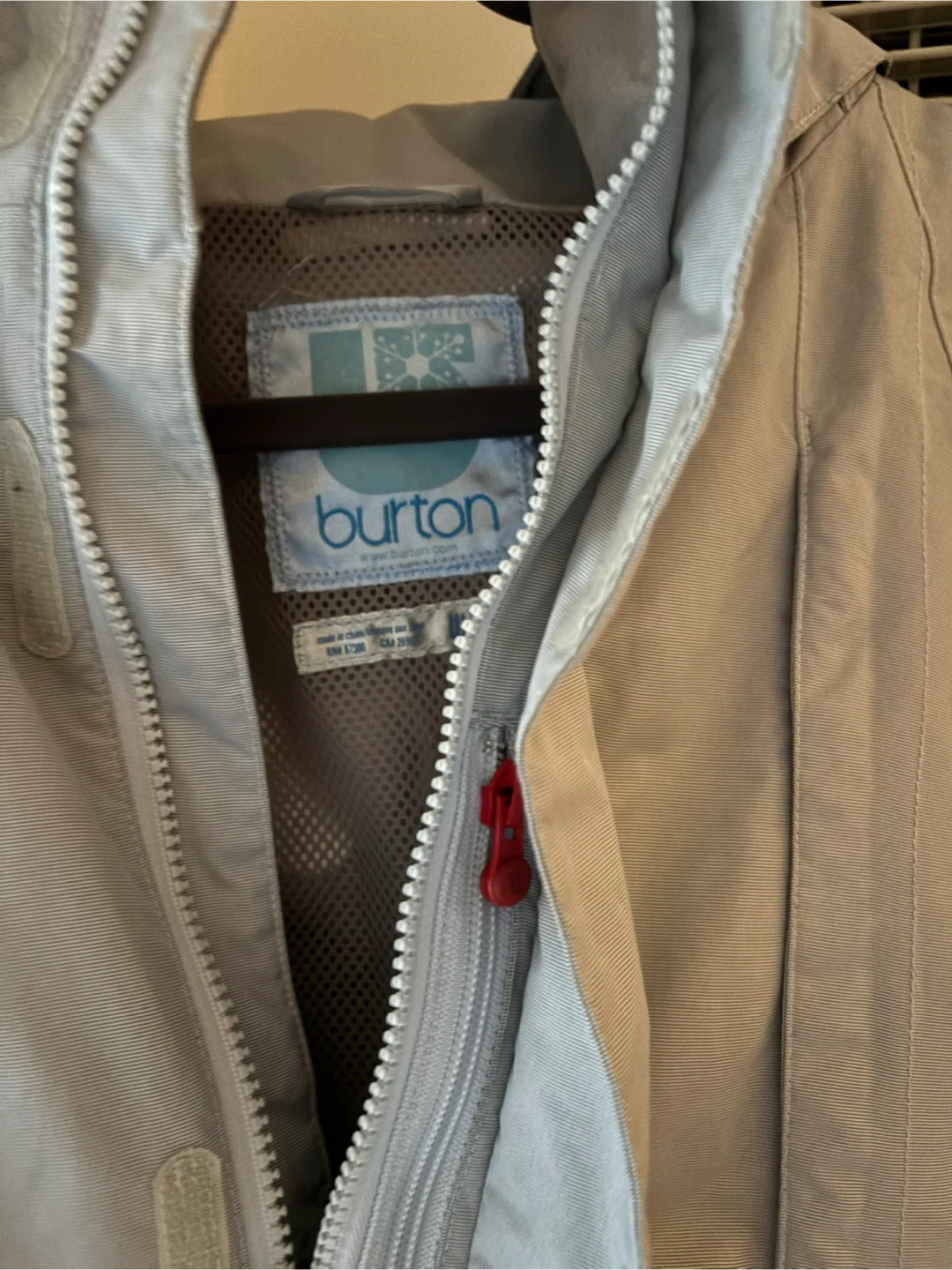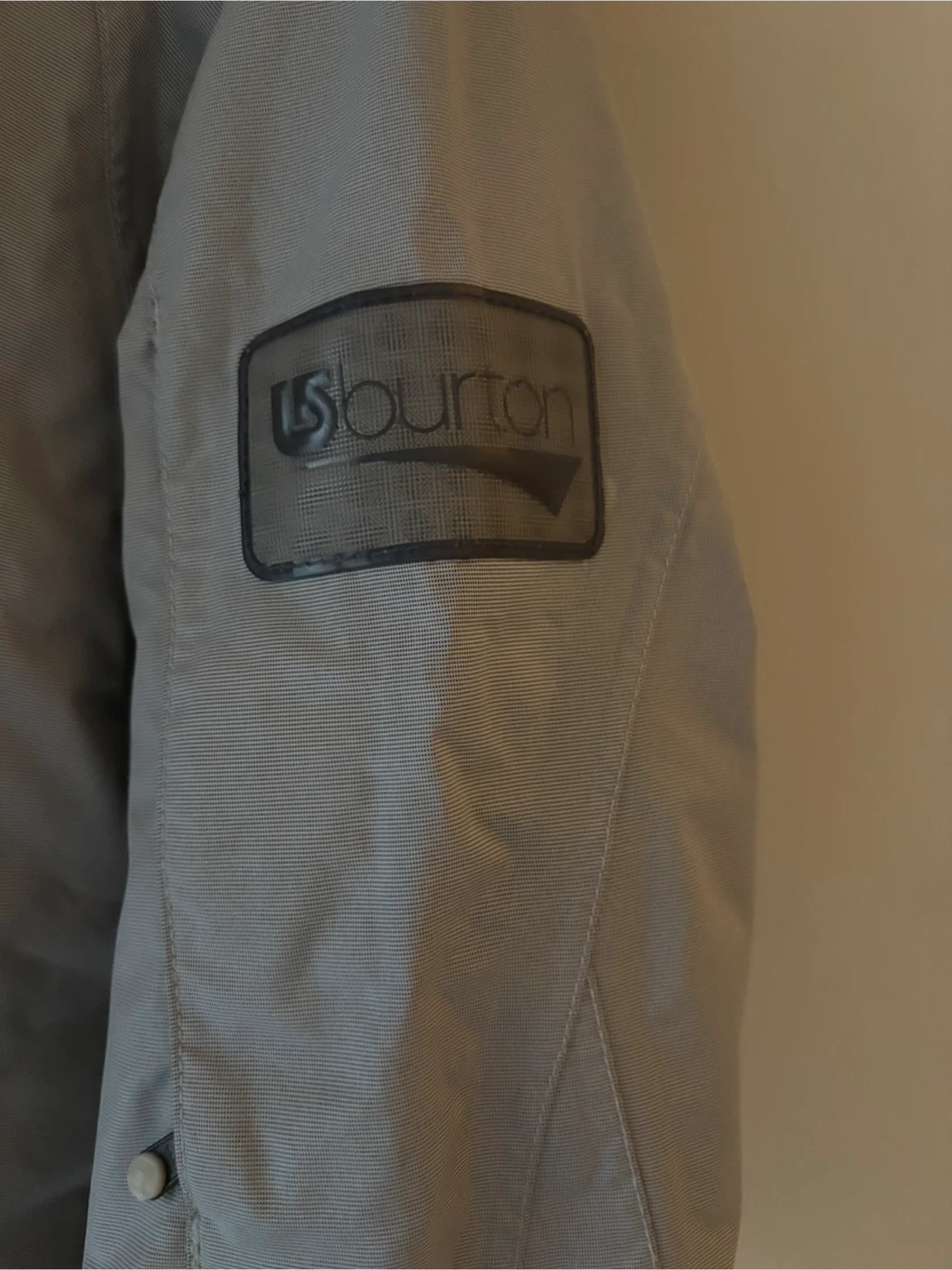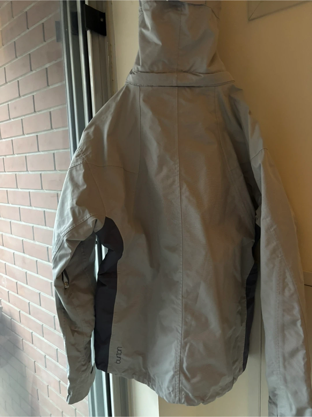 This is a Burton snowboard jacket. It's a light grey colour with darker grey side panels. The jacket has a hood and multiple zippered pockets.