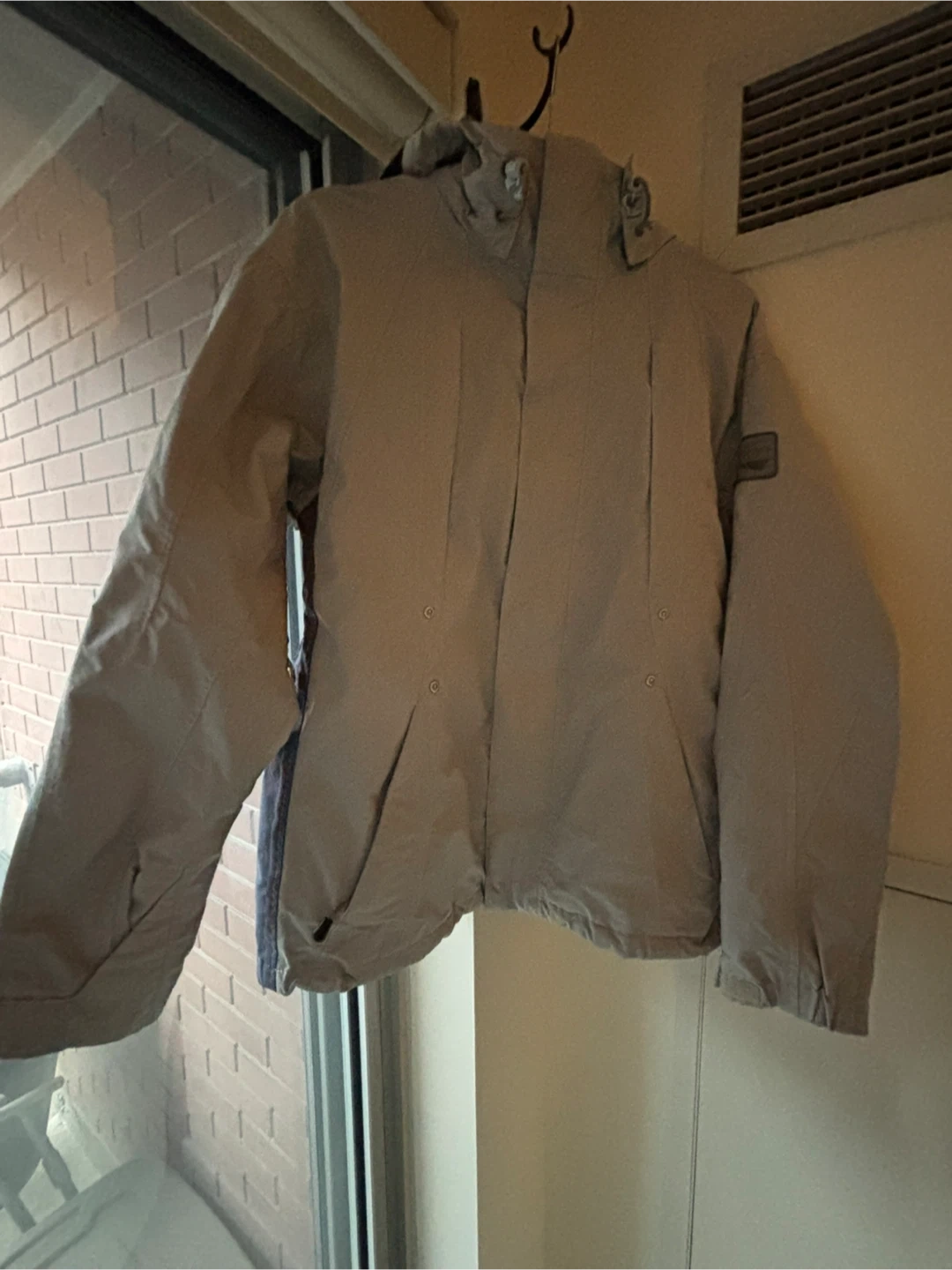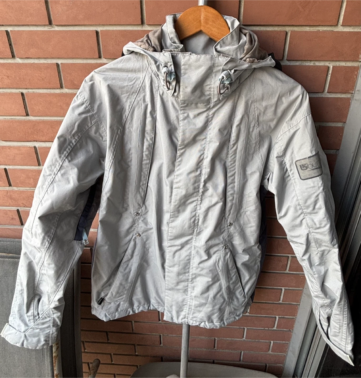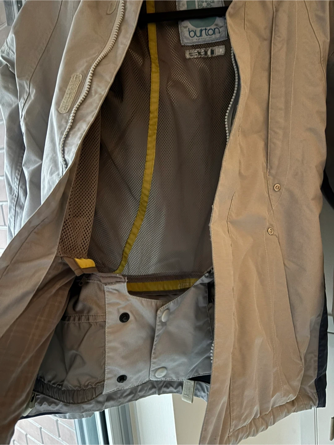 This is a Burton snowboard jacket. It's a light grey colour with darker grey side panels. The jacket has a hood and multiple zippered pockets.