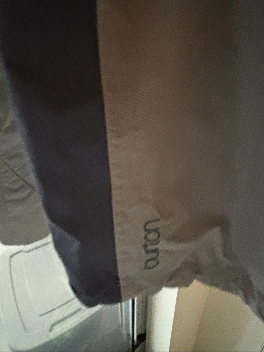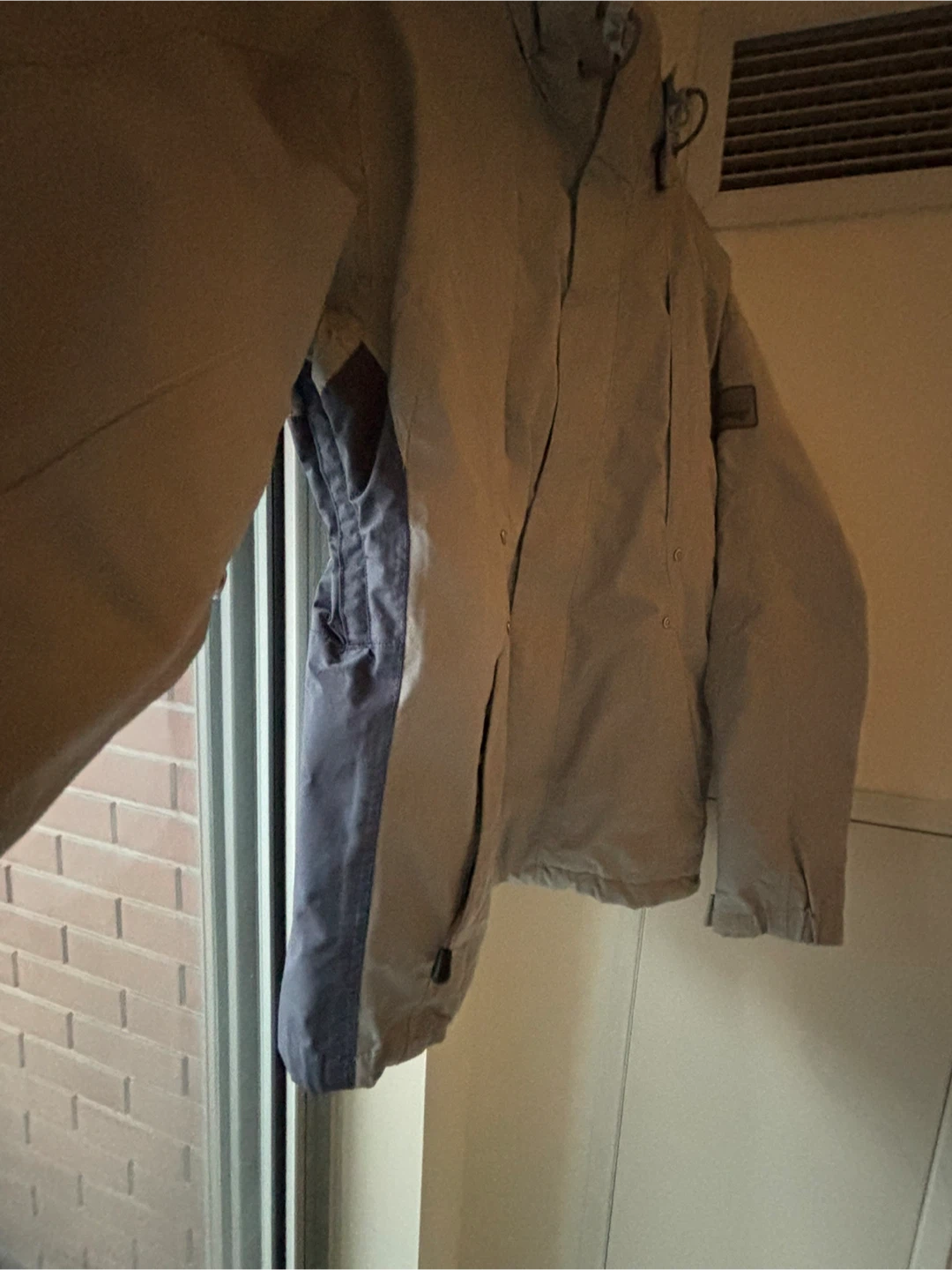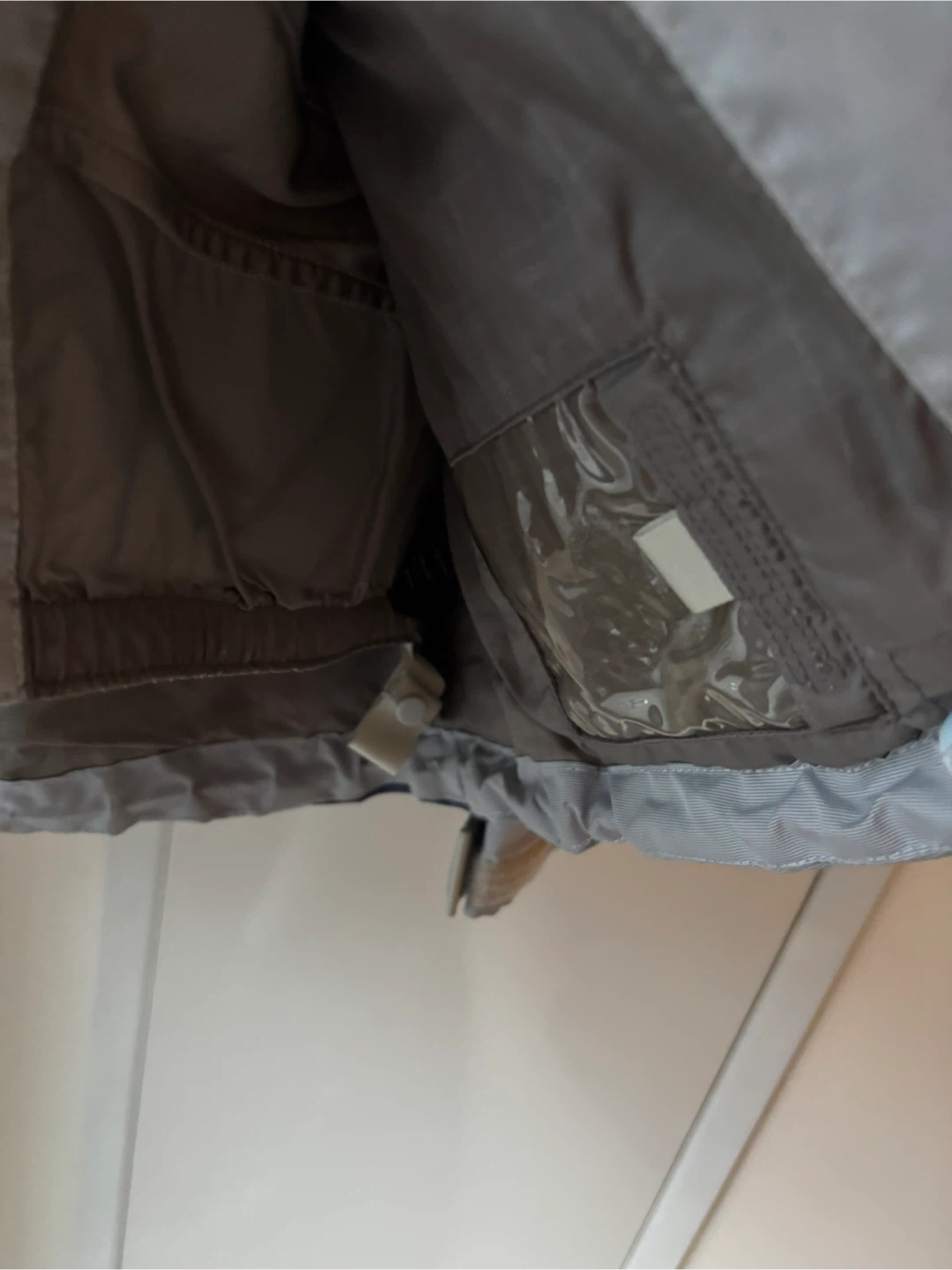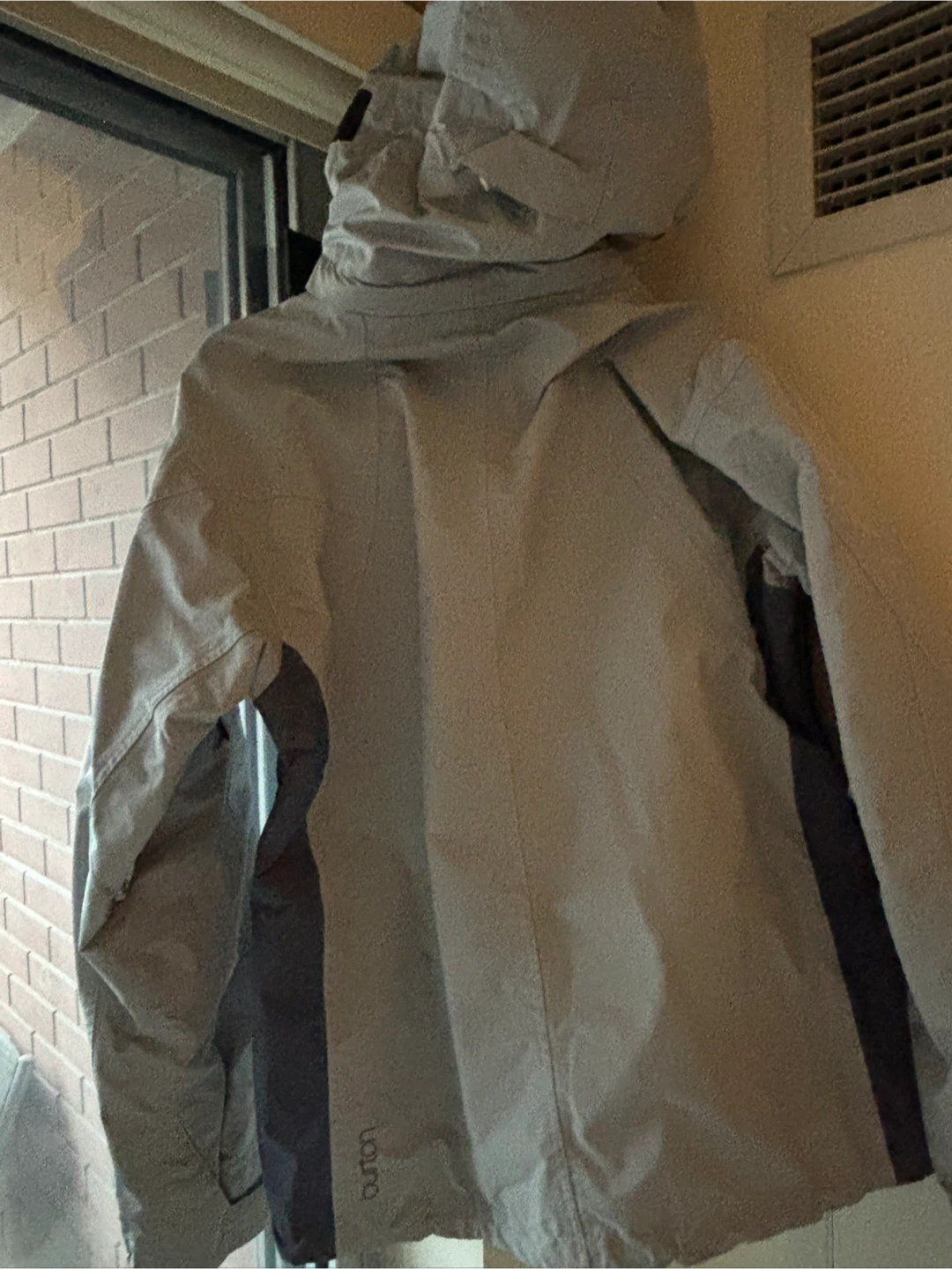 This is a Burton snowboard jacket. It's a light grey colour with darker grey side panels. The jacket has a hood and multiple zippered pockets.