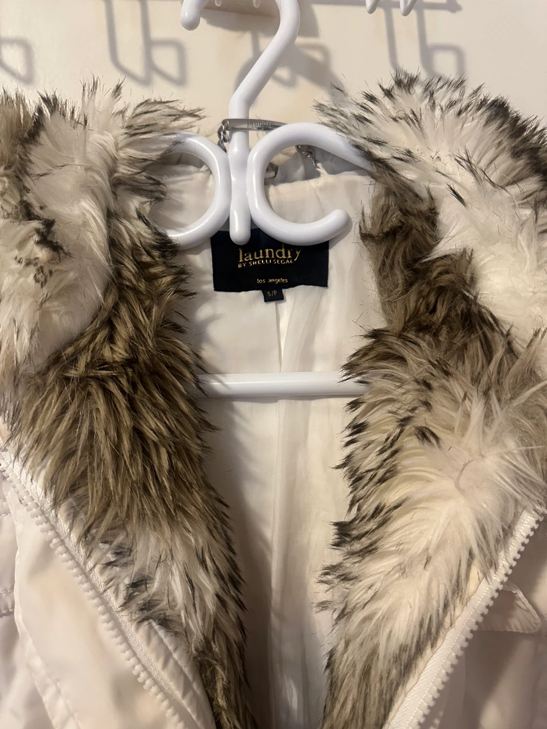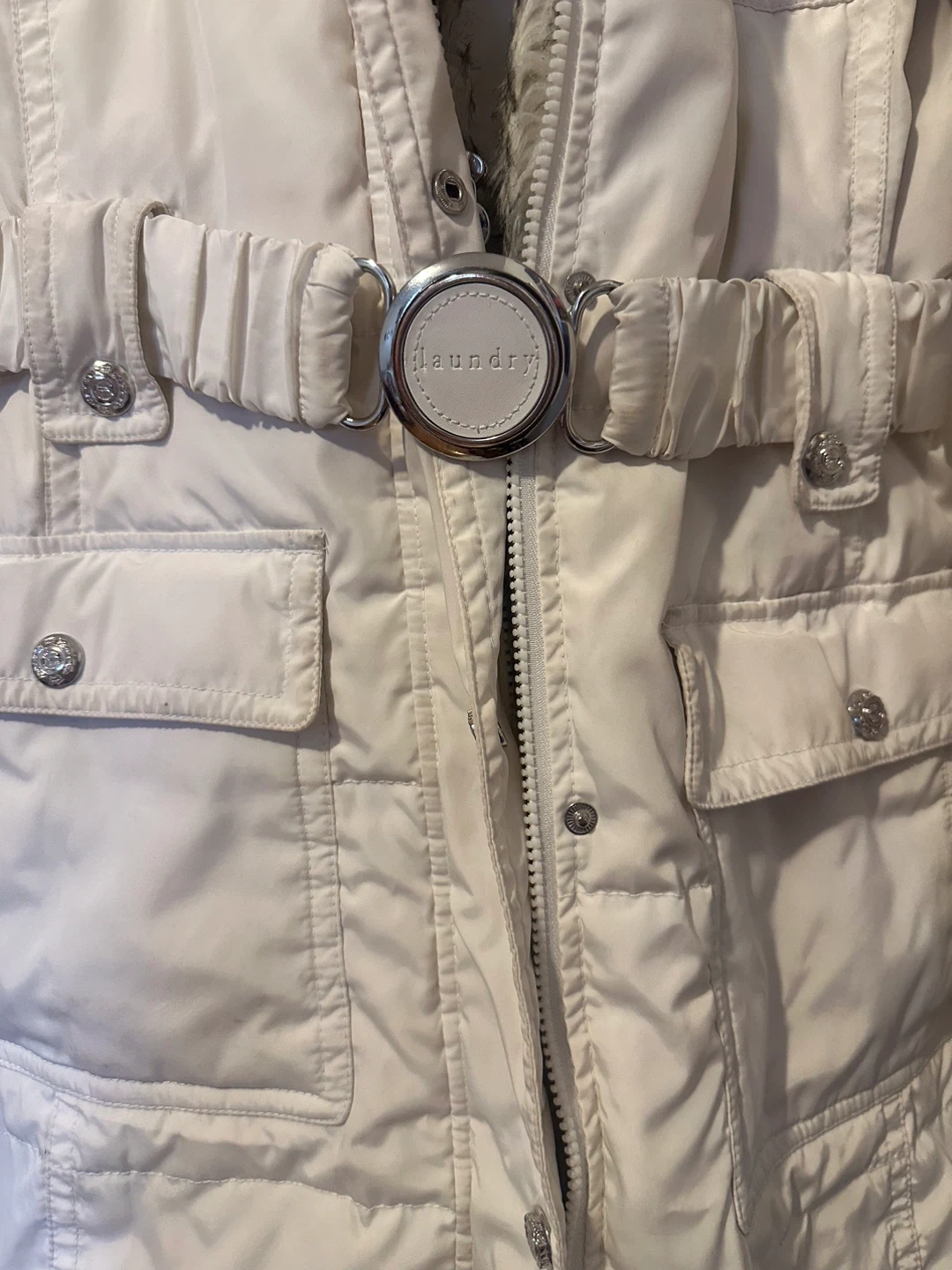Laundry by Shelli Segal white puffer coat with a detachable faux fur trim around the hood. It features a buckle belt at the waist and multiple pockets.