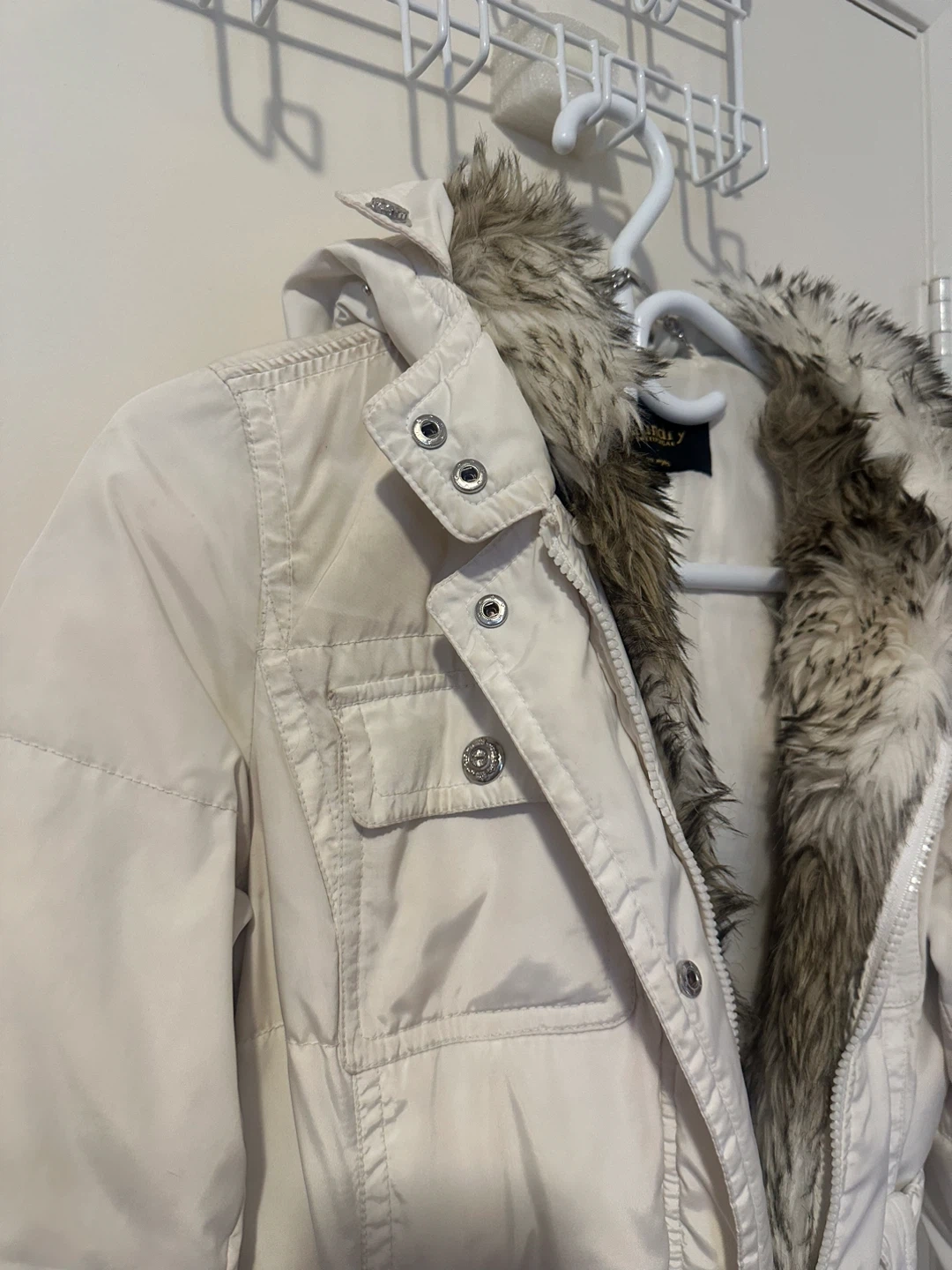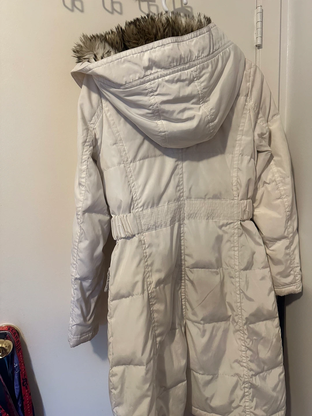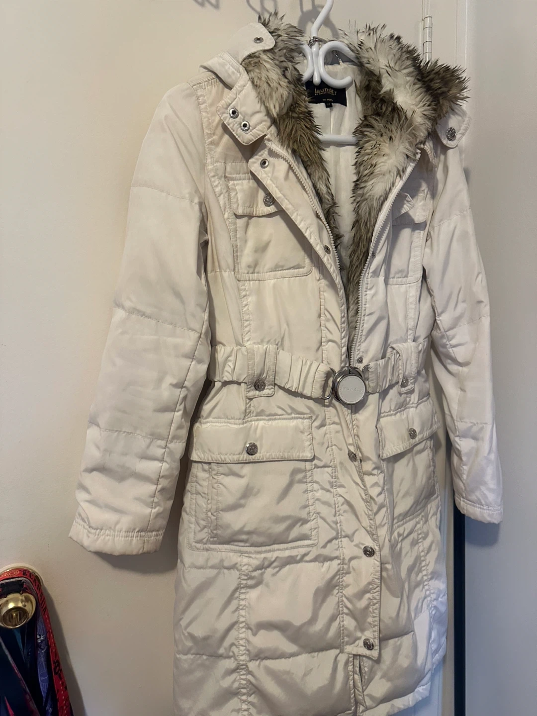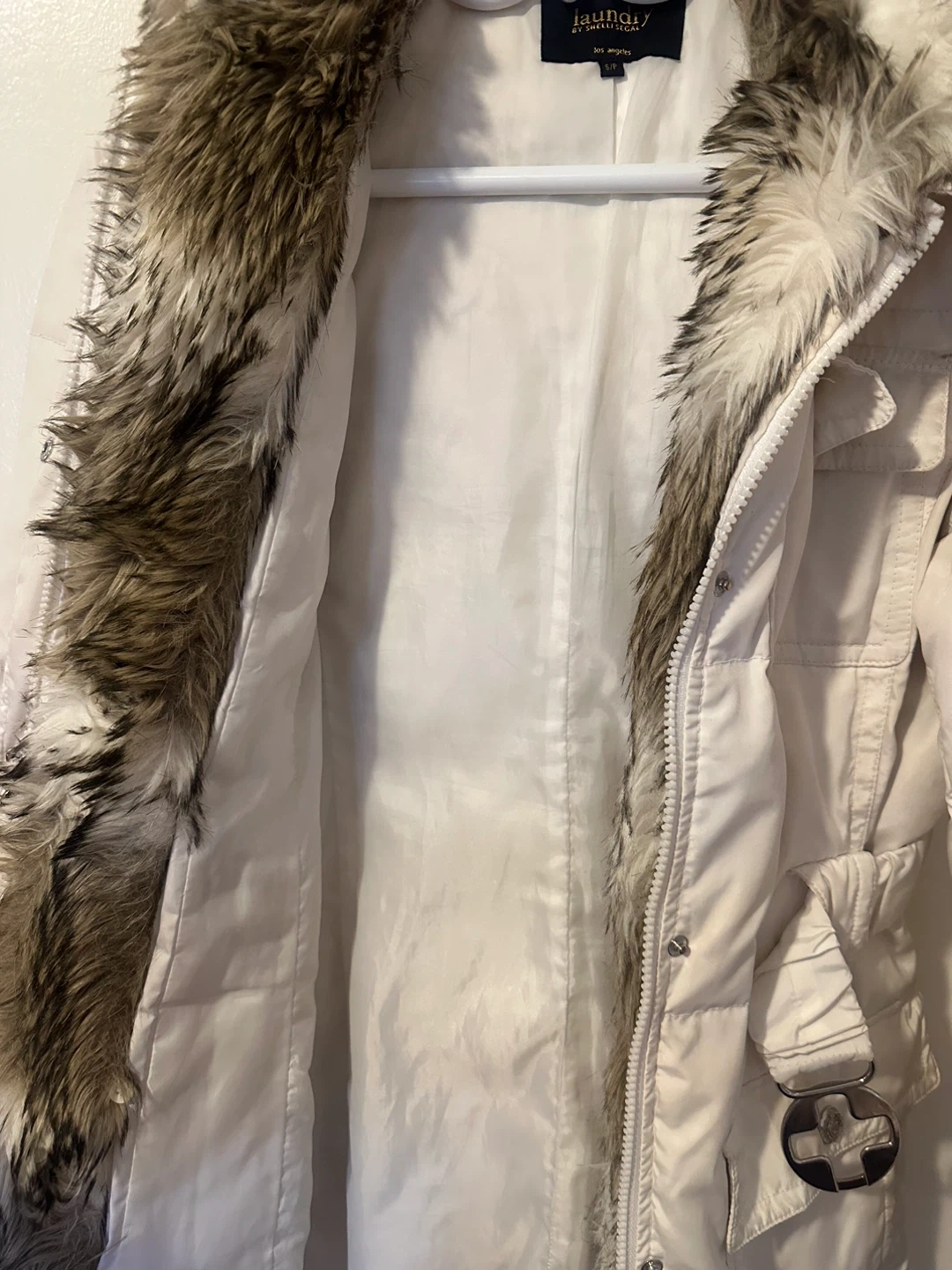 Laundry by Shelli Segal white puffer coat with a detachable faux fur trim around the hood. It features a buckle belt at the waist and multiple pockets.