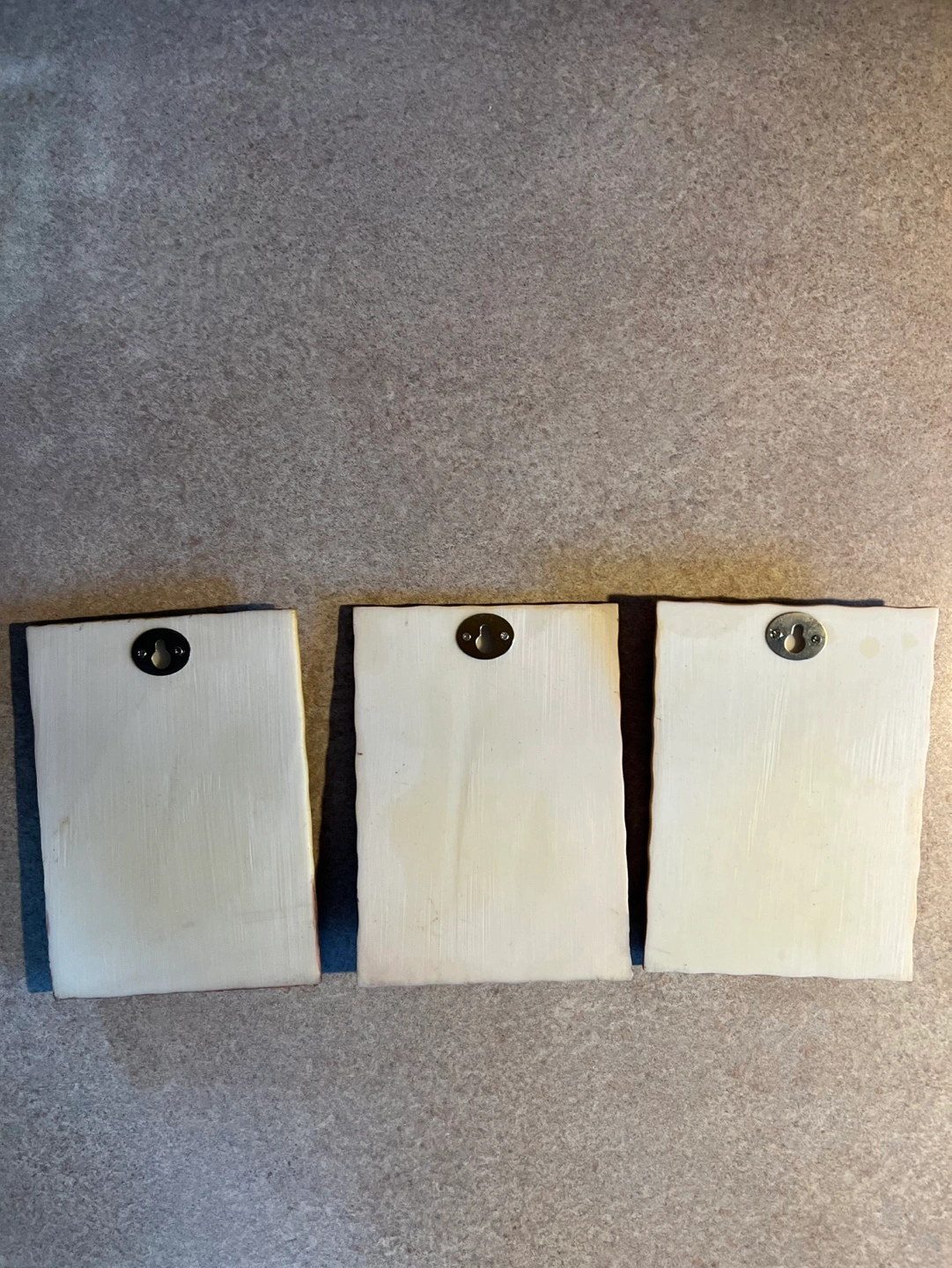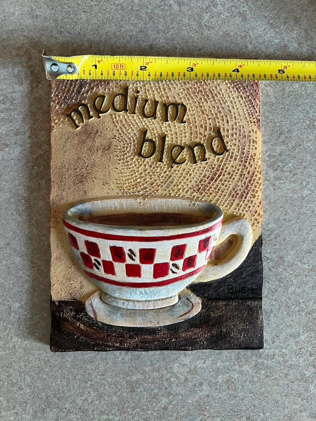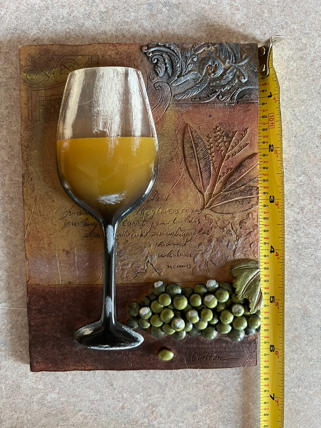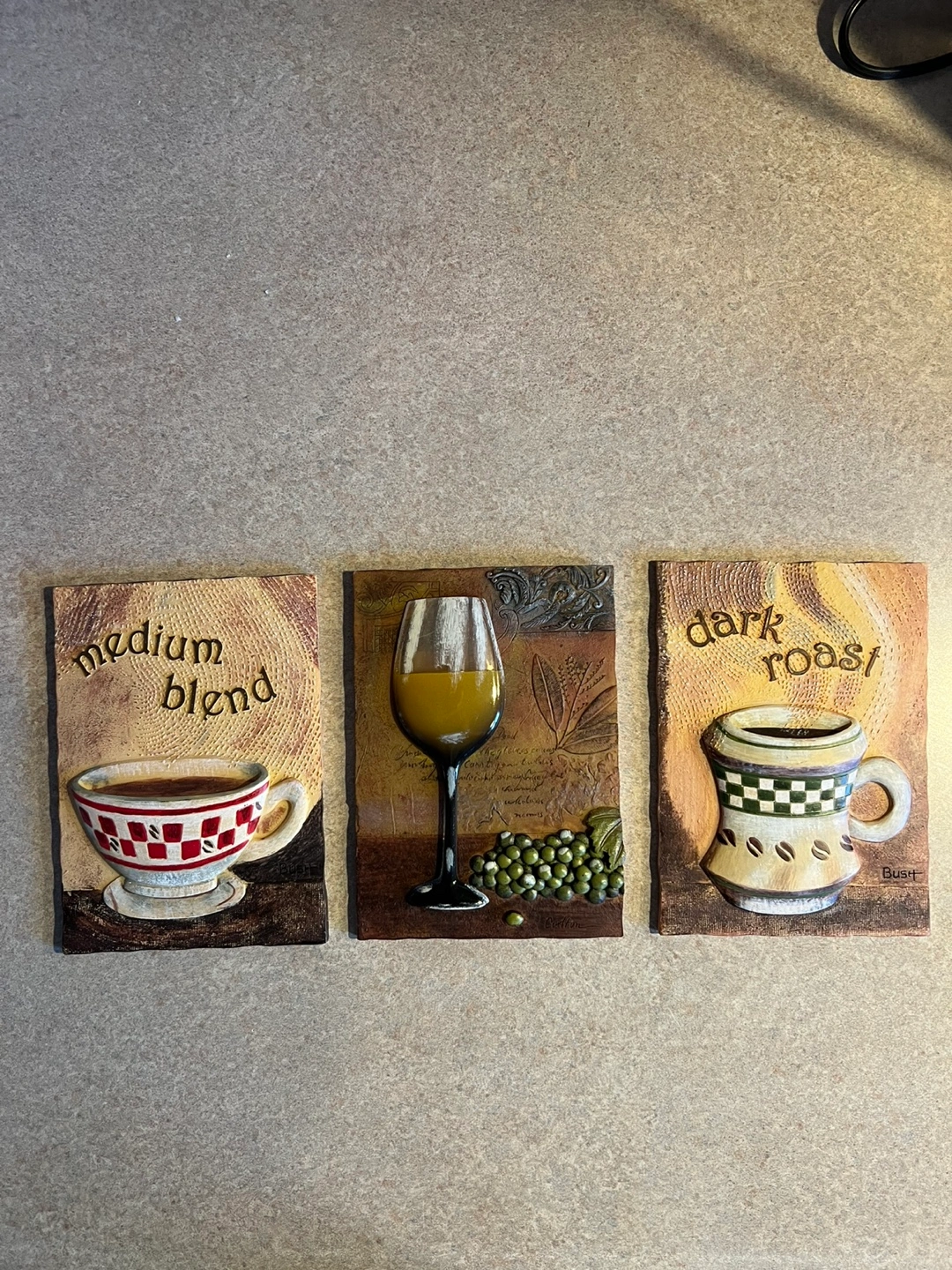 Three decorative wall plaques. Features coffee cup, wine glass, and grapes. Perfect kitchen decor. Each plaque has a hanger on the back. Measures approximately 5" x 7"
