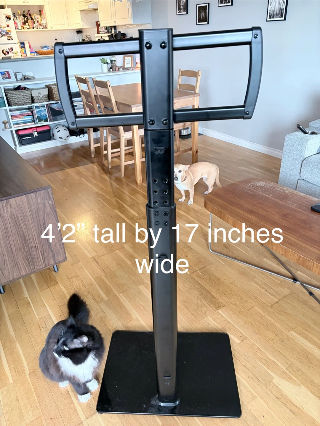 Black metal TV stand. It's 4'2" tall and 17 inches wide. Great for smaller spaces or when you don't want to mount your TV!