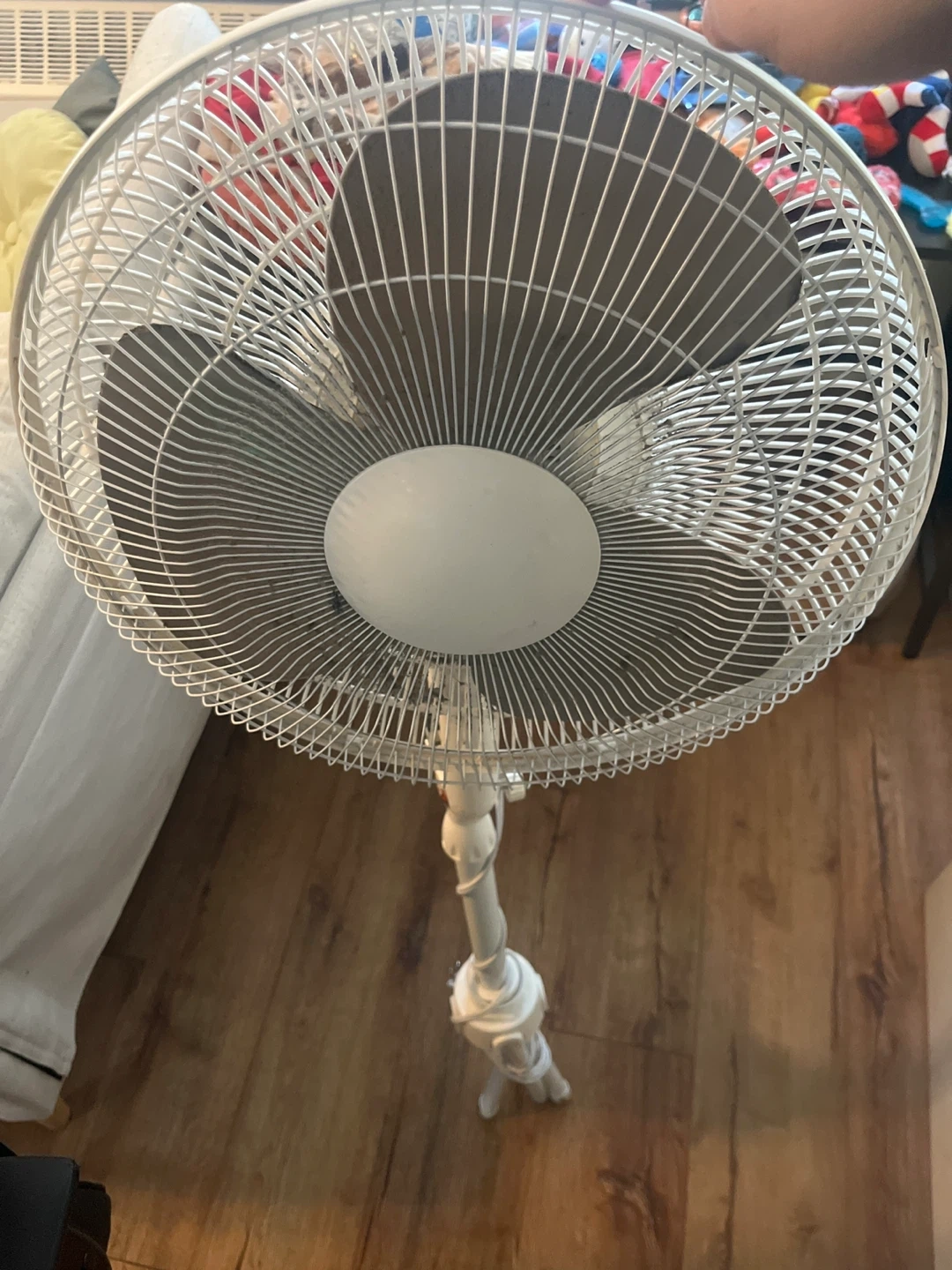 This is a white pedestal fan. It's a standard oscillating model. It's great for keeping a room cool during warmer weather!