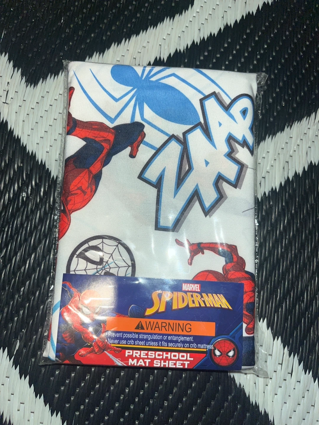 This is a Marvel Spider-Man preschool mat sheet. It fits a standard size mat, measuring 19 in. x 44 in. x 1 in. (48 cm x 112 cm x 3 cm). The sheet is made of 100% polyester and is machine washable on a cold, gentle cycle. It's tumble dry low heat and can be ironed on low heat if needed; do not dry clean.