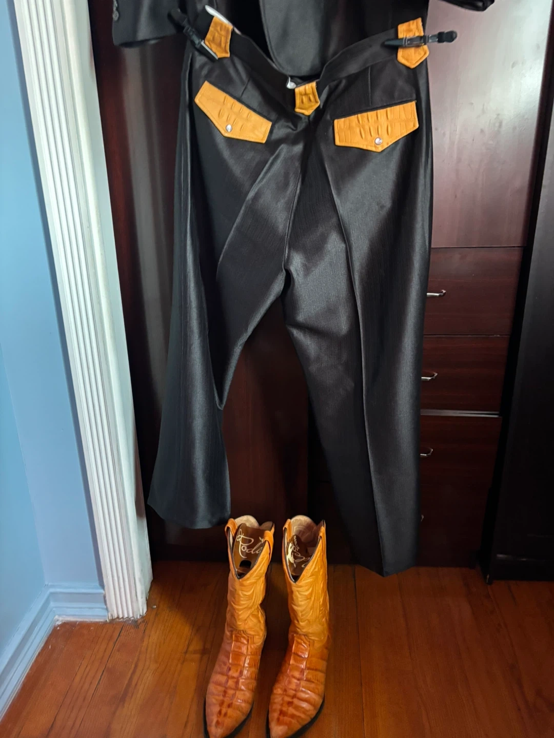 The Original Ostrich Shawl Style Cowboy Jacket in Black Butter Suit with matching boots is a stylish and unique outfit perfect for those looking to showcase their cowboy and western theme. This complete outfit in black and yellow features a standout shawl style jacket, complemented by matching boots, giving off a fashionable and authentic cowboy vibe. Perfect for special occasions or everyday wear, this piece is sure to make a statement and turn heads wherever you go.