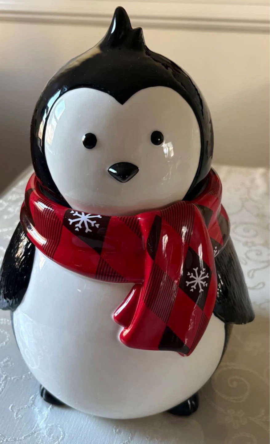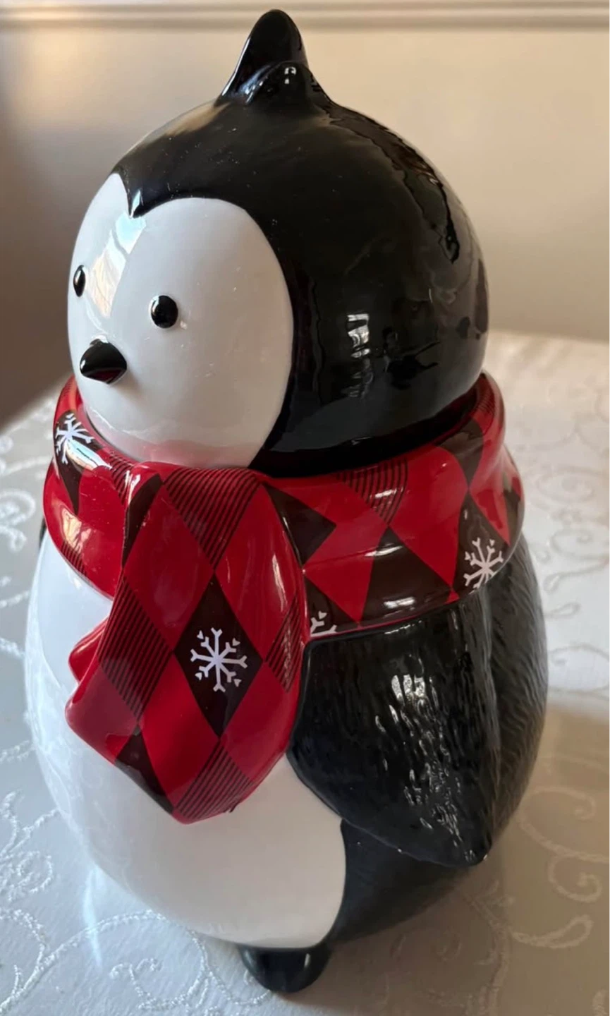 This adorable penguin cookie jar is perfect for storing treats! It features a festive red and black buffalo plaid scarf with snowflakes. Made of ceramic, it's a fun addition to any kitchen counter.