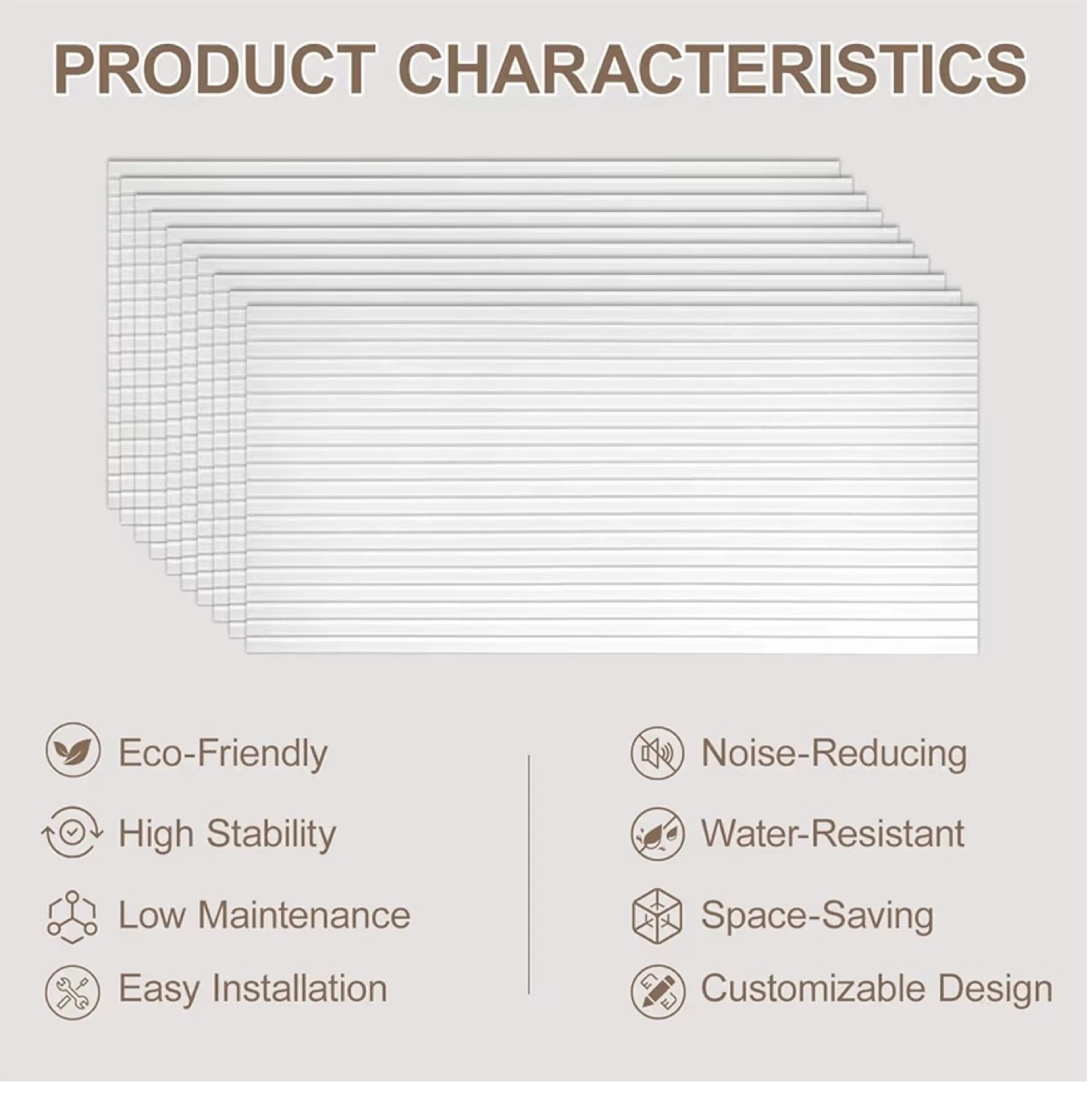 D These acoustic panels are made of polyester fiber and measure 47 inches by 24 inches. They come in a 10-pack. The panels are 0.4 inches thick and cover a total area of 7.43 m². They're excellent for sound absorption, improving room acoustics by reducing echo and noise.
