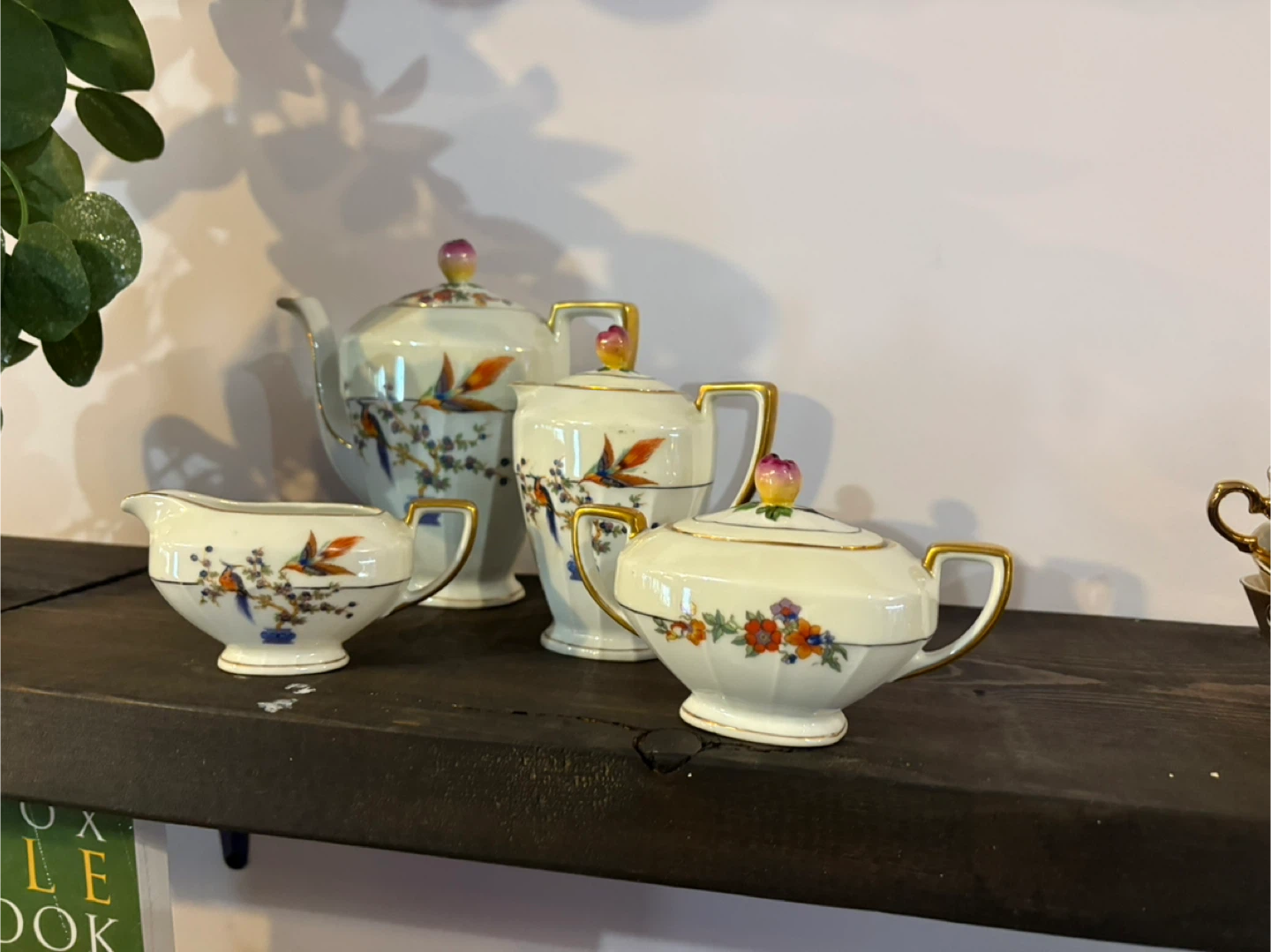 This elegant porcelain tea set features delicate hand-painted birds and floral motifs with gold accents. It includes a teapot, sugar bowl, creamer, and possibly a coffee pot. Perfect for serving tea or coffee during special occasions.