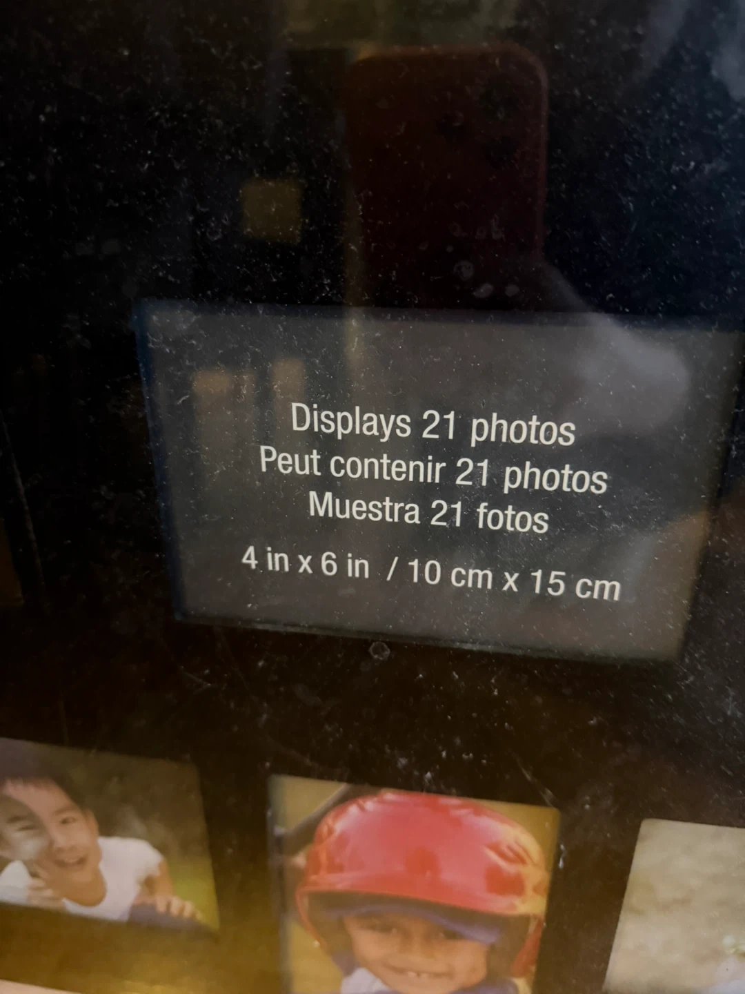This black collage picture frame displays 21 photos. It holds photos sized 4 in x 6 in or 10 cm x 15 cm. Great for showcasing many memories! Brand new in wrapping.