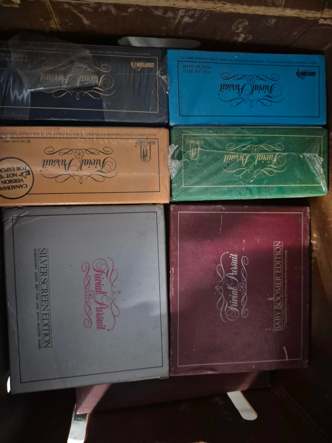 This listing includes several Trivial Pursuit card game sets, including Canadian Edition, Baby Boomer Edition, and Silver Screen Edition. These are subsidiary card sets for use with the master game. They were manufactured and distributed in Canada.