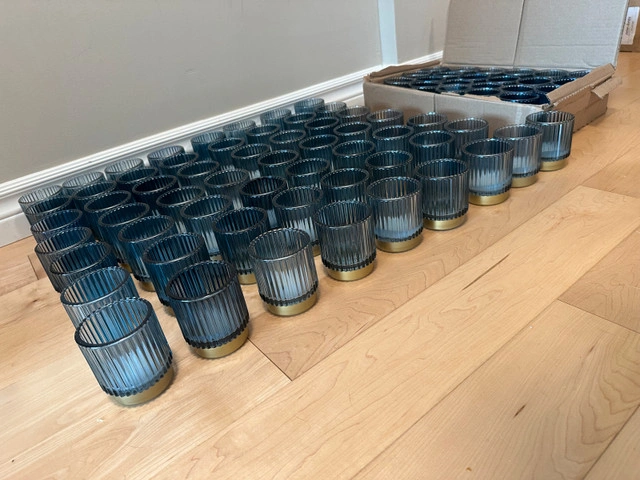 1079 Blue Votive candle holders with gold base. Each is about 3 1/4" tall and 2 1/2" wide. Used for my recent wedding! Pickup only (downtown Belleville). The candles I used have a 10hr burn time and we only burned them for a couple hours. Most of the votives still have candles inside still. Selling the whole set for $150